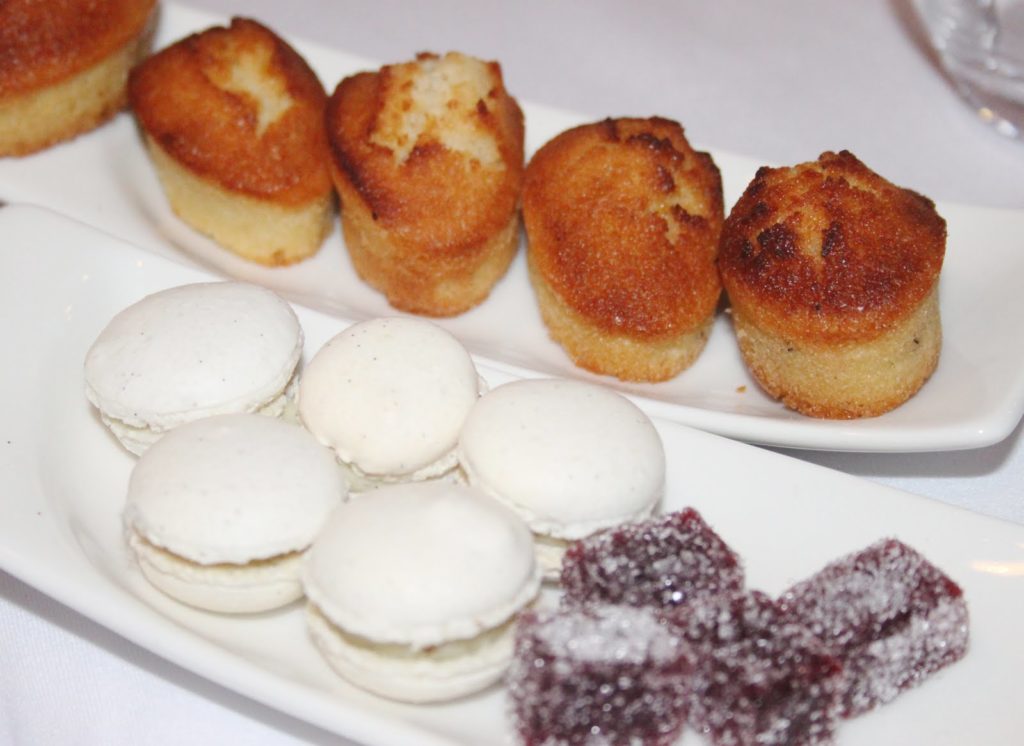 Rien à voir avec le maïs, mais juste pour le plaisir des yeux, les petites mignardises servies avec le café. Des mini-macarons à la vanille et de fondants financiers.