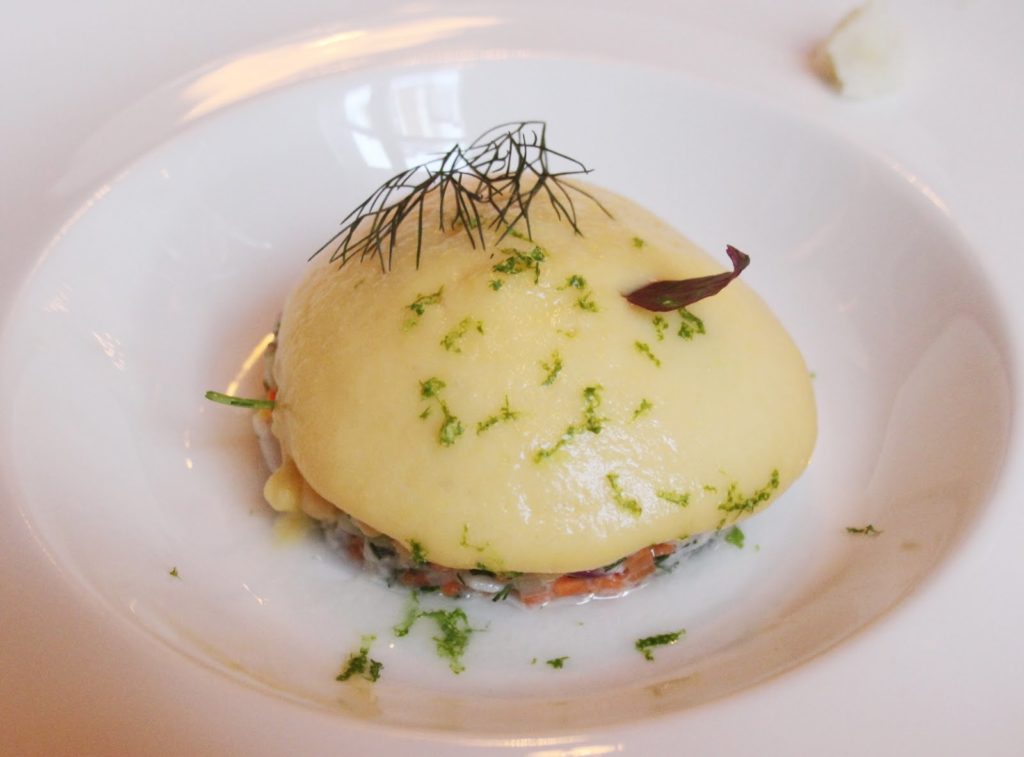 L’entrée arrive sans tarder et on découvre rapidement le talent et la créativité de Sylvain Sendra! Un tartare de daurade savoureux, surmonté d’une mousse de maïs et citron.