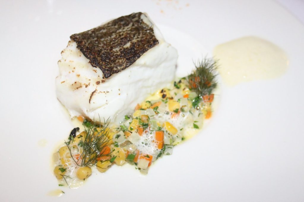 Arrive ensuite un filet de cabillaud parfaitement cuit et grillé sur la peau, servi avec une ratatouille de maïs.