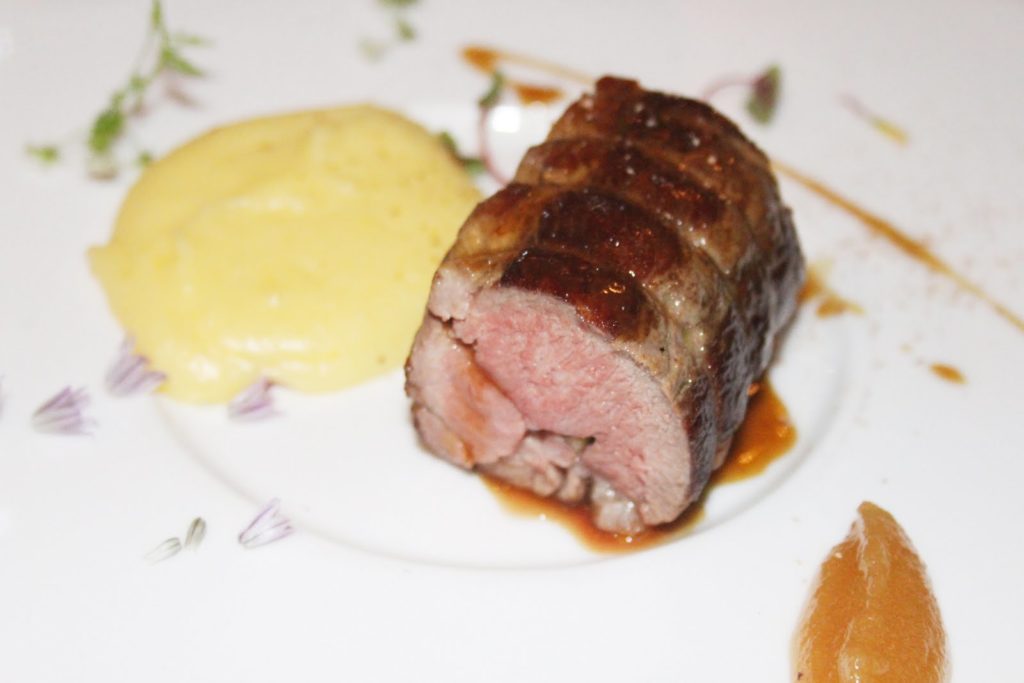 Ce n’est pas fini et nous continuons avec un filet d’agneau cuit à la perfection ( une merveille!!), servi avec une purée de pommes de terre et maïs.