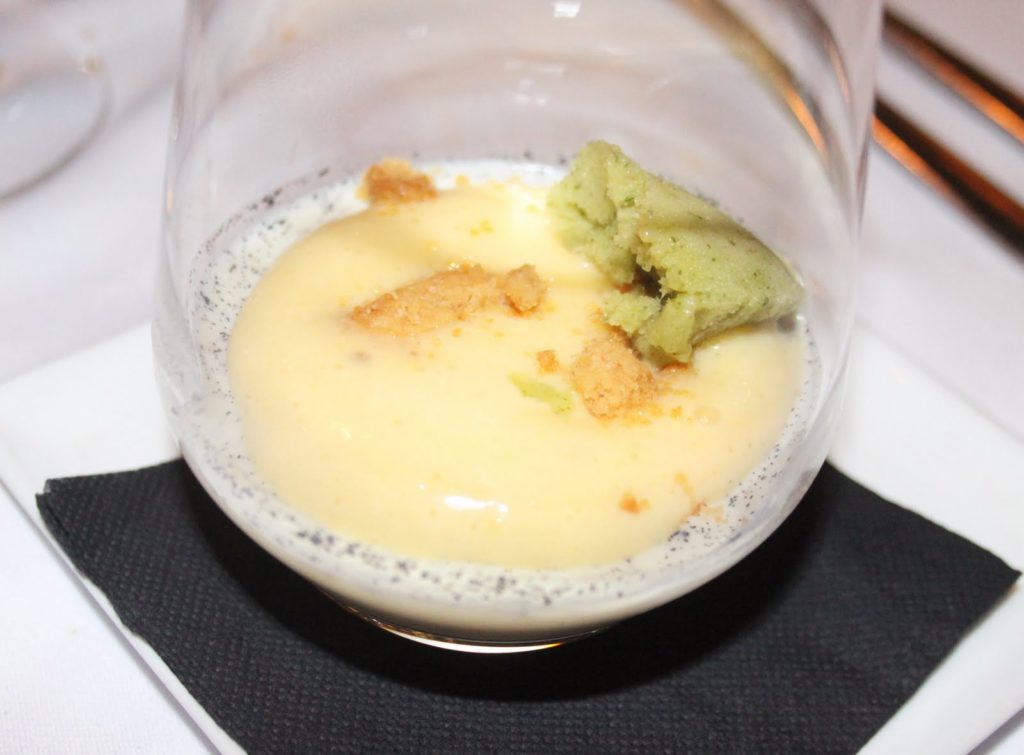 Pour le dessert, un panna cotta à la vanille, avec une mousse de maïs. Le maïs étant naturellement doux, il se combine très bien ici avec un granité à la menthe et des petits morceaux de crumble!