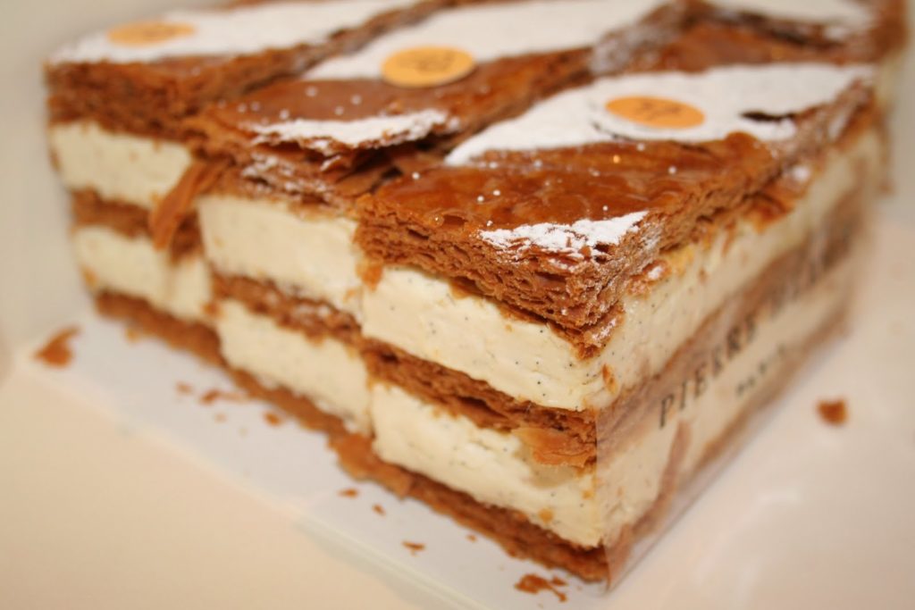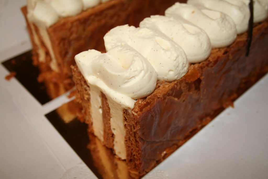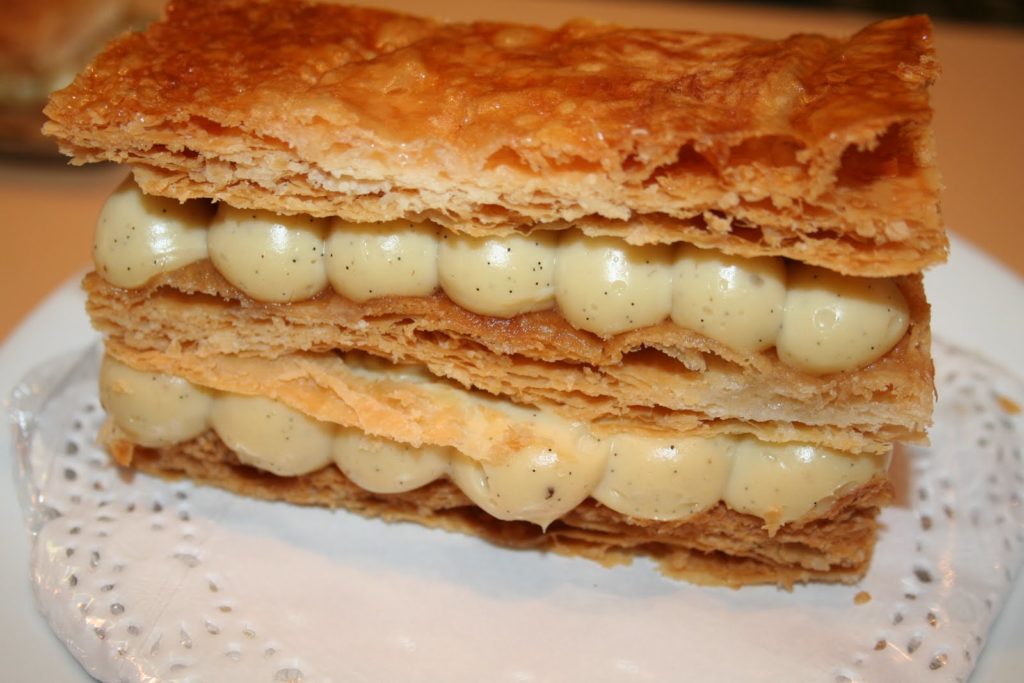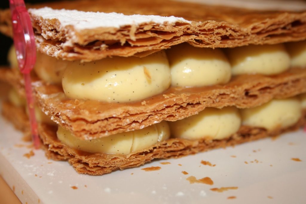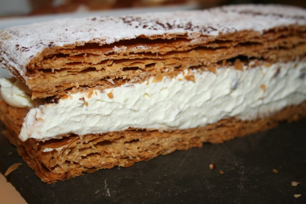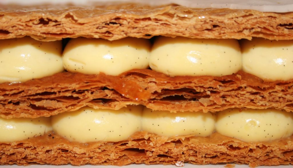 Le mille-feuilles traditionnel comporte, ainsi, plusieurs couches de fines pâte feuilletée séparées par de la crème pâtissière. Sa surface est recouverte de fondant blanc après avoir été abricotée et les côtés sont masqués par des amandes mondées et toastées. Mais longtemps on décora le dessus de petits anneaux découpés à l’emporte-pièce dans de la pâte feuilletée et cuits séparément. Le mille-feuilles peut être petit et individuel ou grand à partager. Mais toujours frais. »
