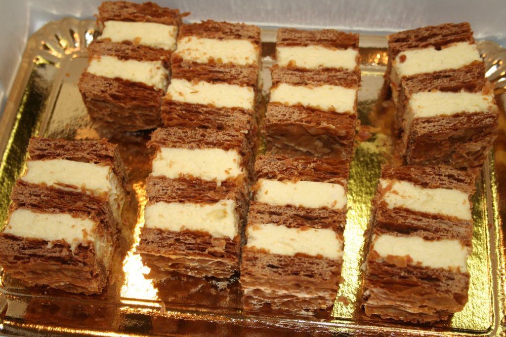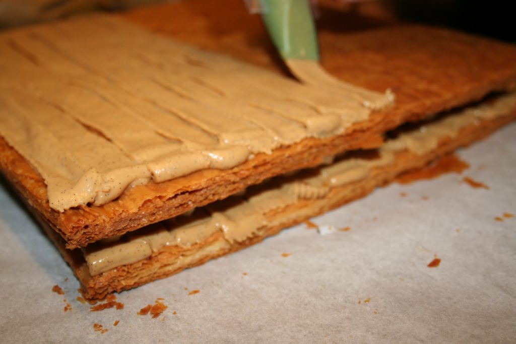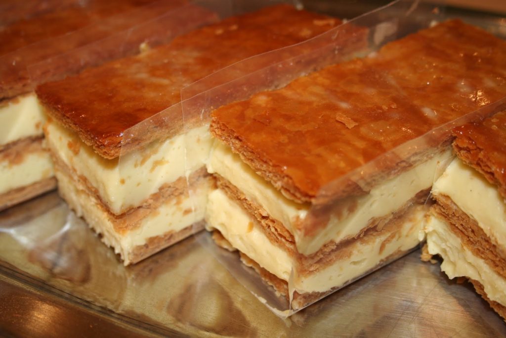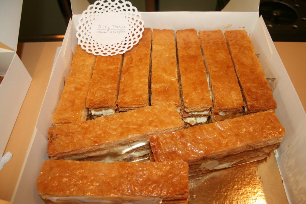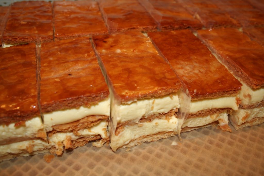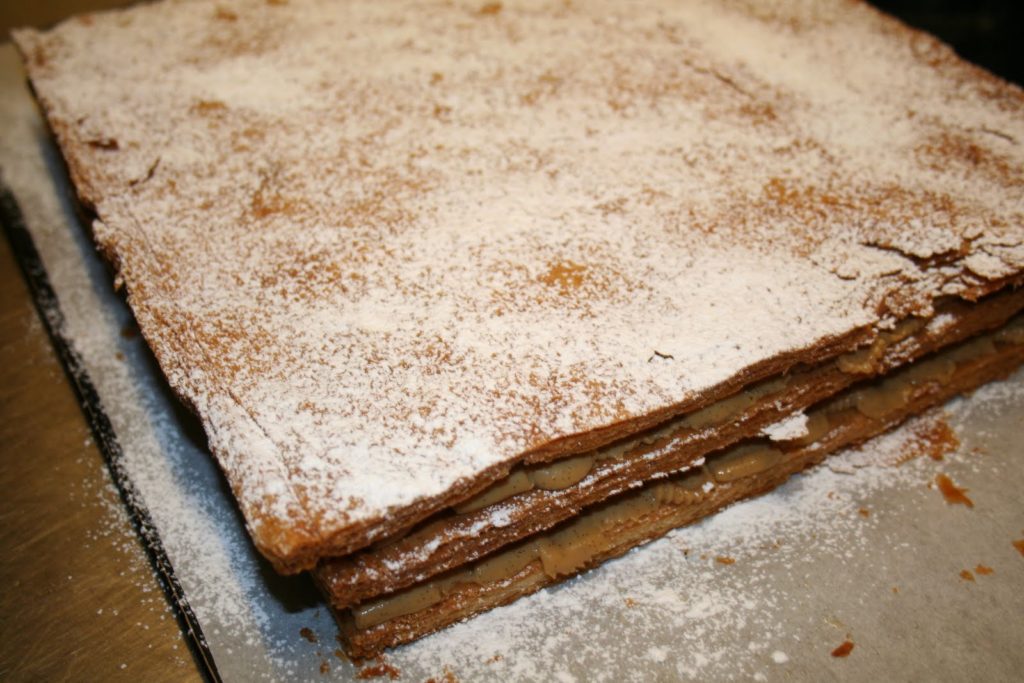 Le mille-feuilles traditionnel comporte, ainsi, plusieurs couches de fines pâte feuilletée séparées par de la crème pâtissière. Sa surface est recouverte de fondant blanc après avoir été abricotée et les côtés sont masqués par des amandes mondées et toastées. Mais longtemps on décora le dessus de petits anneaux découpés à l’emporte-pièce dans de la pâte feuilletée et cuits séparément. Le mille-feuilles peut être petit et individuel ou grand à partager. Mais toujours frais. »
