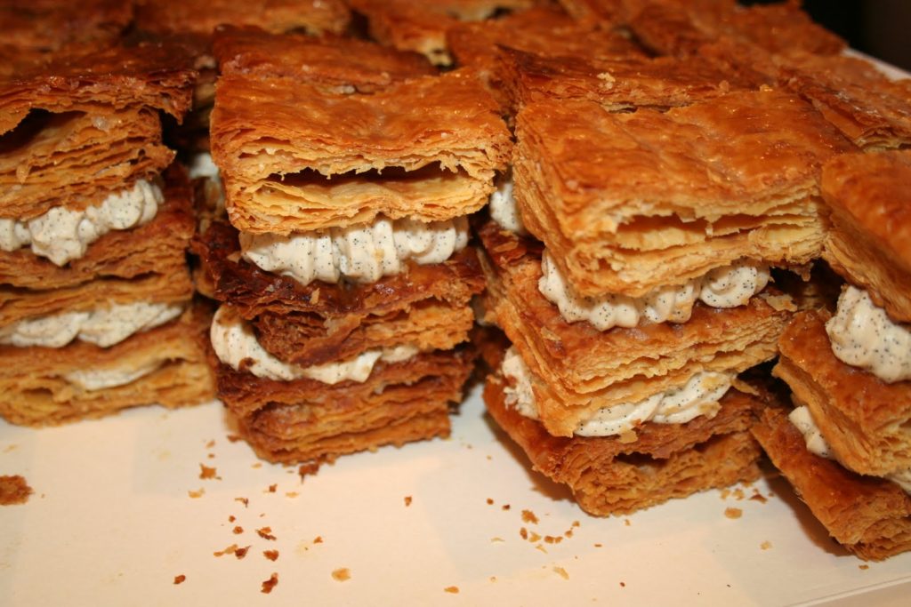 Le mot est entré dans le dictionnaire en 1906…cent ans après que la recette du mille-feuilles eut été publiée par un certain Rouget dont on ne sait plus rien et sans obtenir le moindre succès jusqu’au jour de 1867 où un nommé Sergent (ou Seugnot), pâtissier parisien établi dans le bas de la rue du bac, le proposa à sa clientèle. On dit que ce gâteau délicat, en pâte feuilletée à six tours (c’est à dire six pliages consécutifs), dénommée par les anglais -puff pastry- se vendit alors quotidiennement par centaines.
