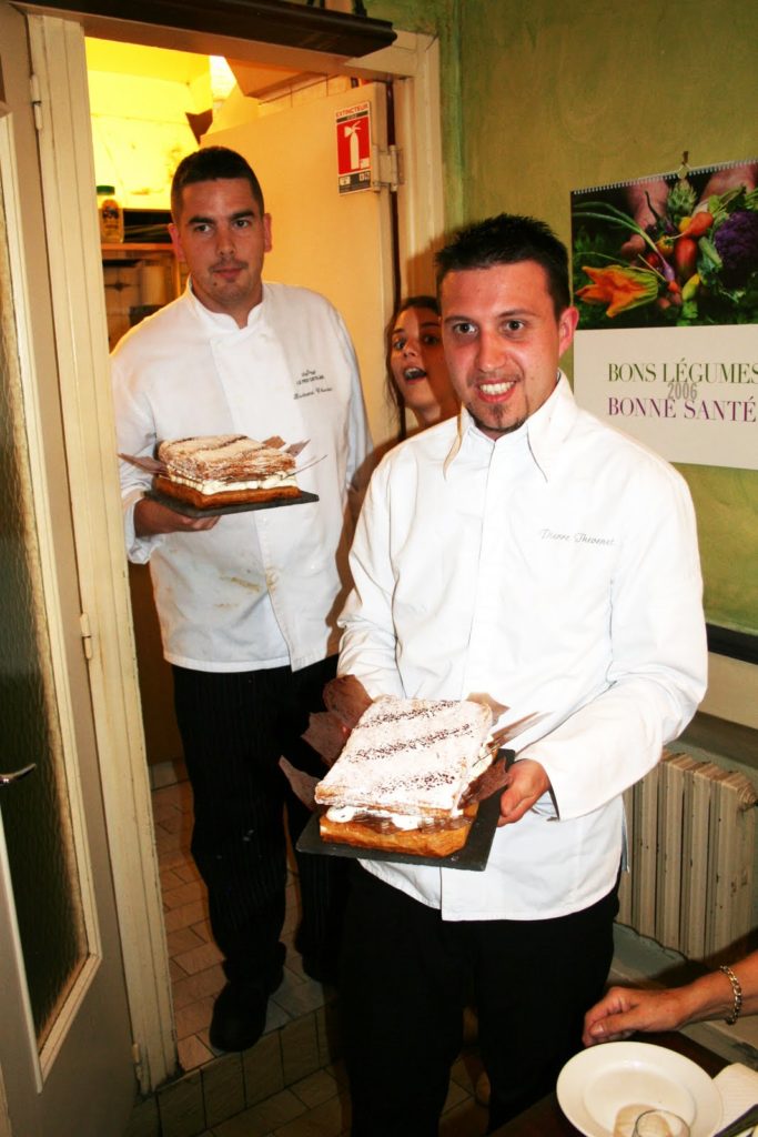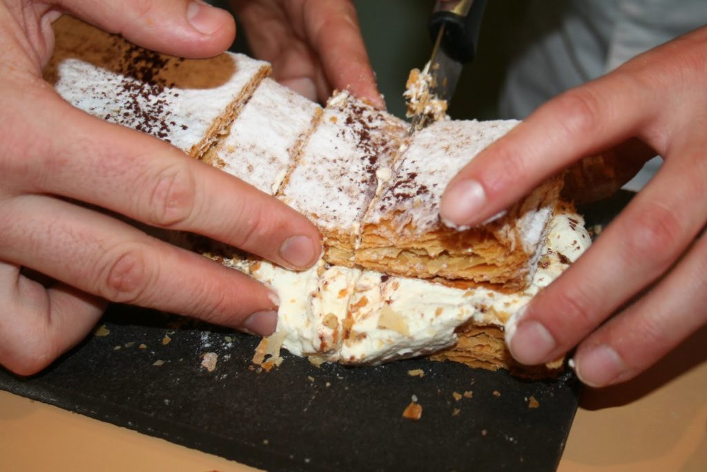 Pas facile de couper un mille-feuilles! Il faut s’y mettre à plusieurs. Le problème de notre rendez vous était qu’il y faisait très chaud (30 degrés en cette journée du 29 Juin 2010!) et que les crèmes, dès leur sortie du réfrigérateur se mettait à ramollir, rendant donc les gâteaux parfois instables et périlleux à trancher!