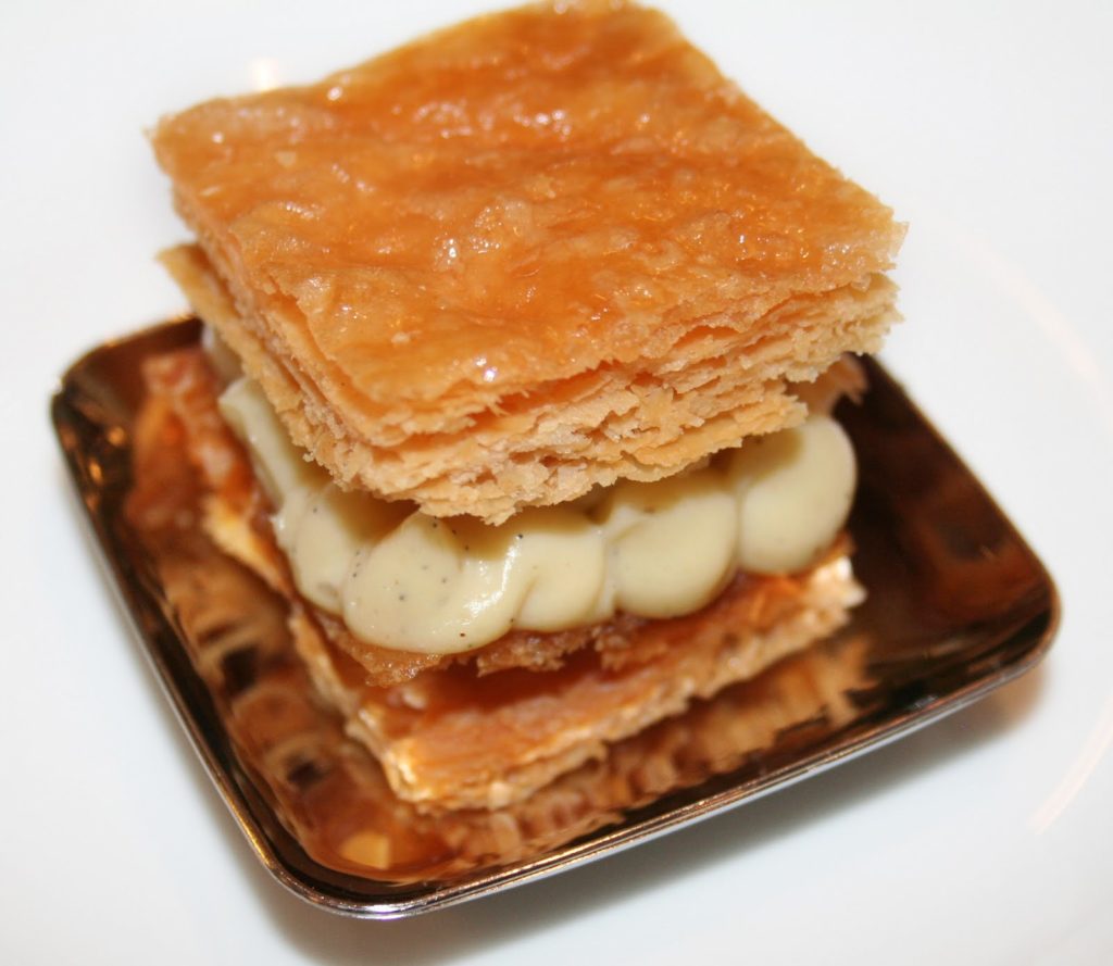 Non, je ne vous propose pas la recette (pas encore du moins!) du mille-feuilles, mais je vous fais découvrir la dégustation à laquelle j’ai eu l’immense chance et le surtout le plaisir de participer. Onze mille-feuilles d’exception, venant de onze établissements parisiens prestigieux, trente personnes pour les savourer, dont les chefs pâtissiers qui les ont préprarés, gourmands amateurs et éclairés, chocolatiers et un historien gastronomique sans oublier notre organisatrice…