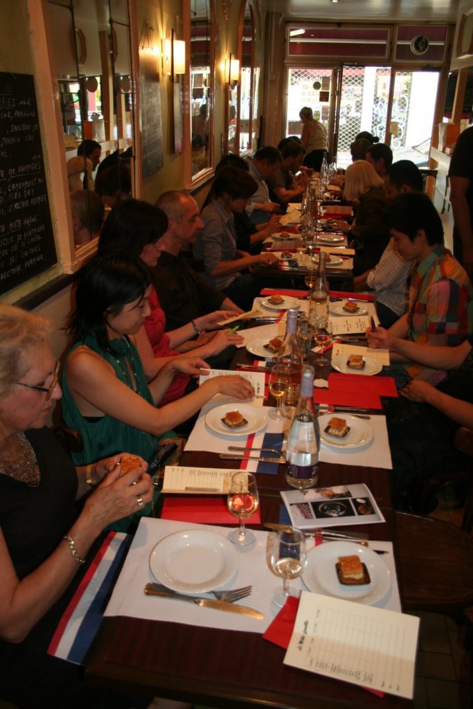 Après cette introduction nous voilà tous réunis autour d’une grande table (il y en avait une autre à côté, plus petite) au Coude à Coude (sympathique petit restaurant/bistrot à vin au 46, rue Saint Honoré, 75001Paris) prêts à savourer nos mille-feuilles. D’abord un par un, puis deux par deux pour mieux comparer les textures et les saveurs.