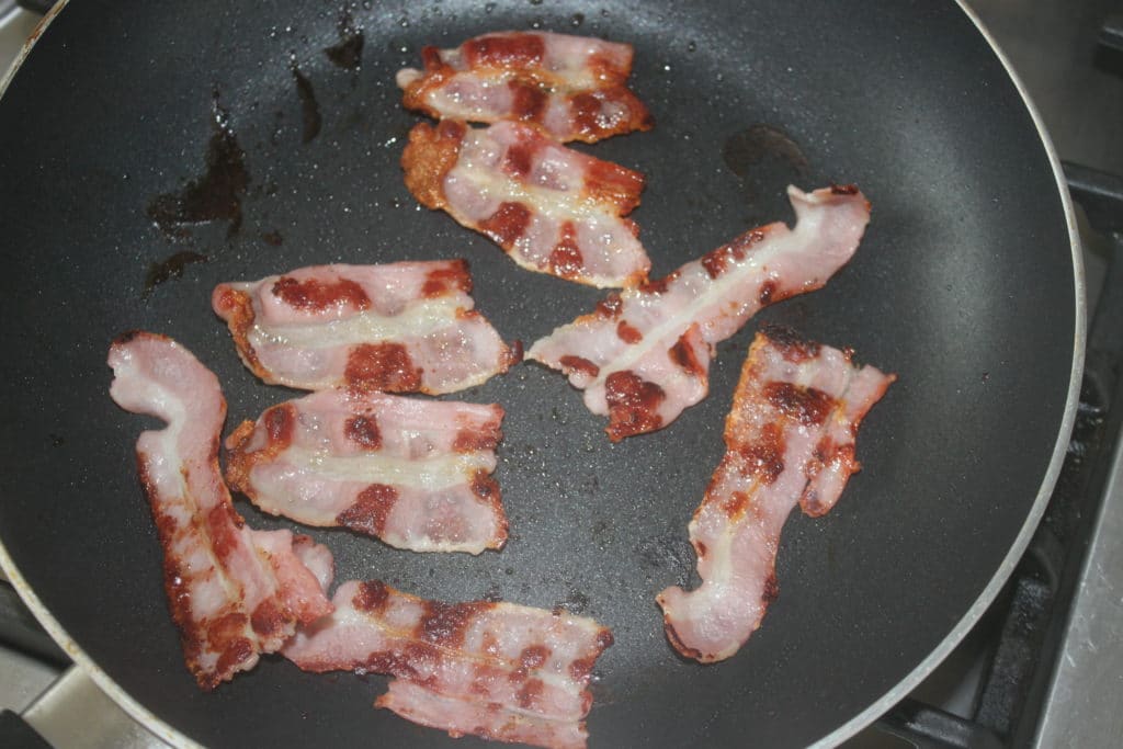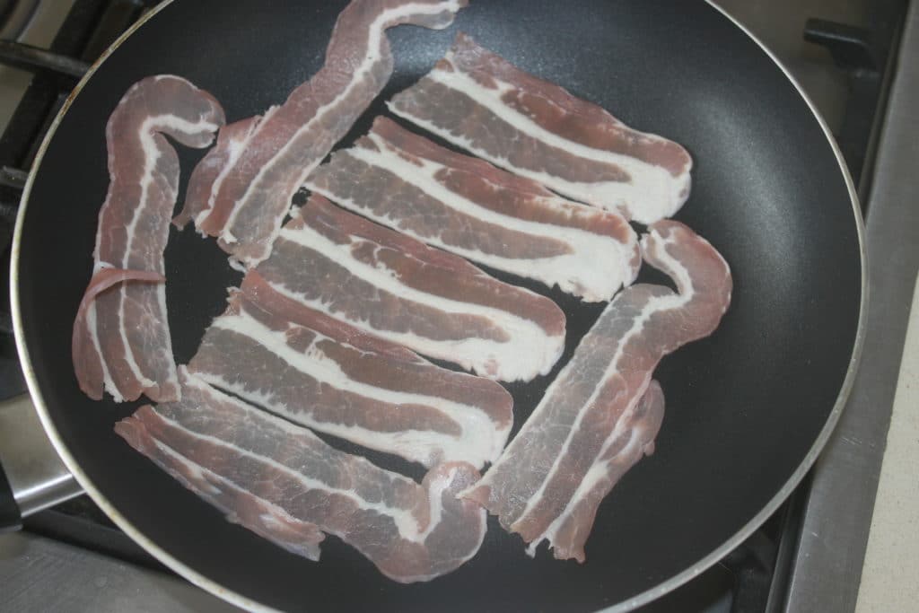 - Faites cuire les tranches de bacon à la poêle pour les faire bien dorer.