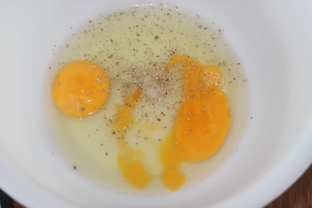 Préparez la pâte en mettant les 3 œufs (sur la photo il n’y a que deux, mais c’est bien 3), du sel et du poivre à votre goût.