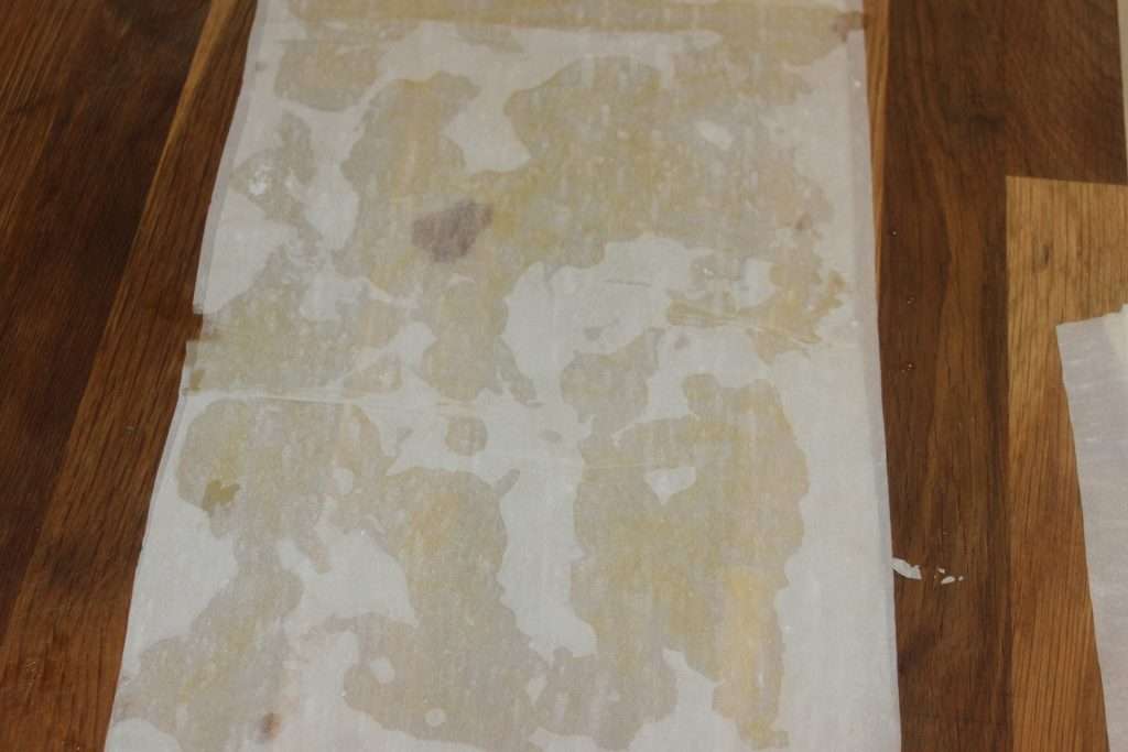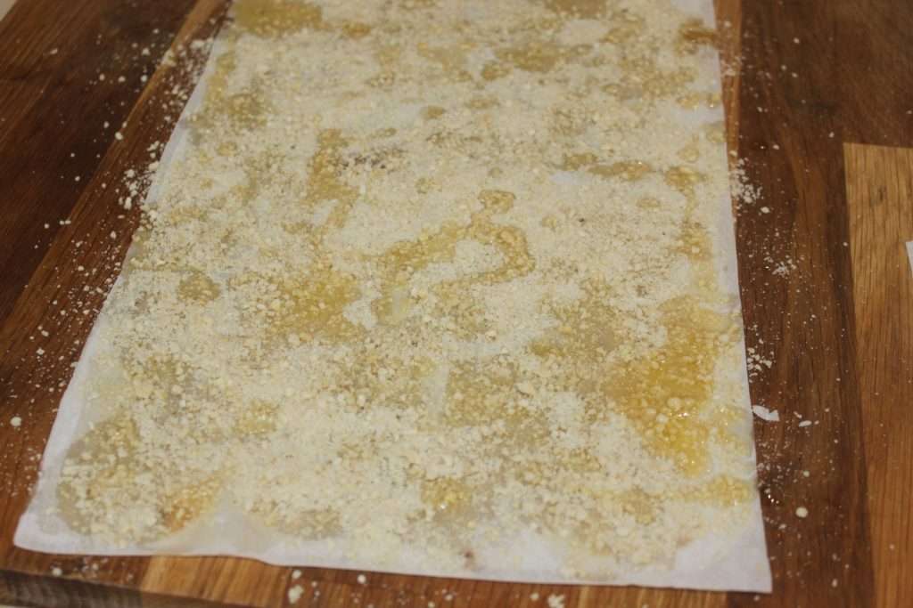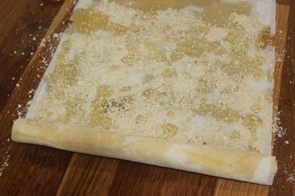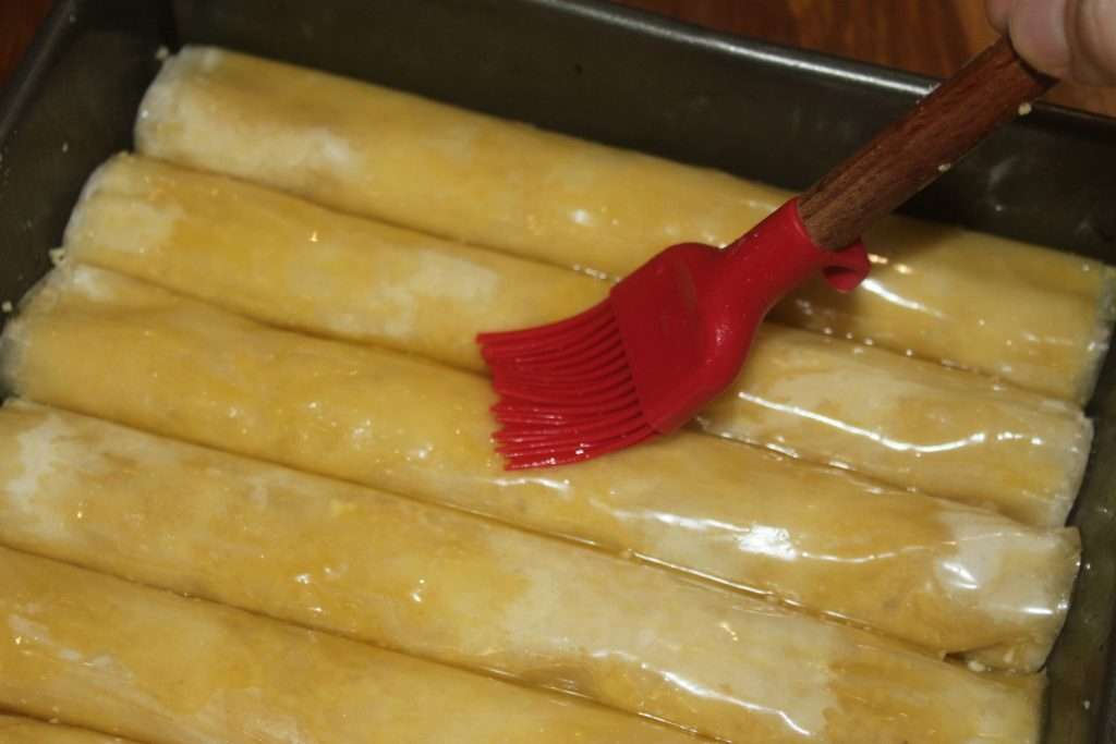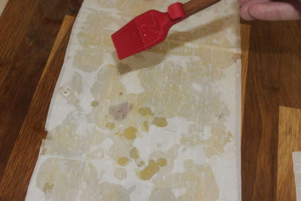 - Déroulez une feuille puis posez-la sur le plan de travail. Arrosez avec la matière grasse fondu. Posez une deuxième feuille puis arrosez à nouveau. Pas besoin de badigeonner toute la surface des feuilles. Vous arrosez aléatoirement, c’est déjà très bien.