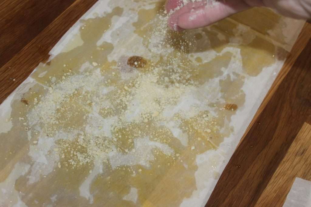 - Parsemez avec la poudre sucrée de noix de cajou. Je laisse juste une bande libre de toute poudre vers le haut. En gros, je parsème partout, sauf 1/5 ème du haut pour permettre de bien fermer le rouleau au moment de son enroulement.