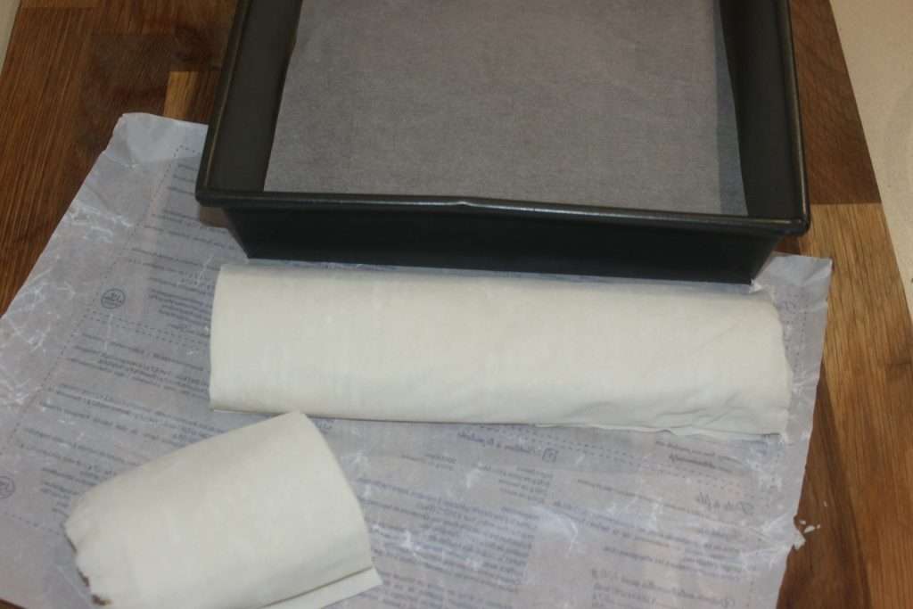 - Coupez la pâte à la taille du moule. Je mets juste un papier sulfurisé dans le fond du moule.