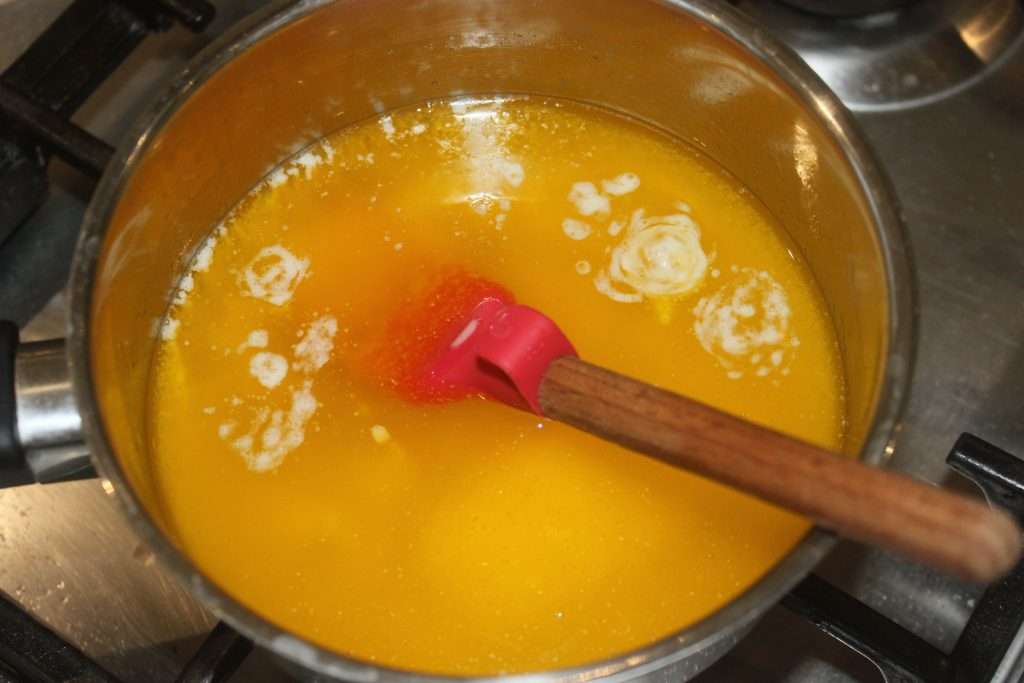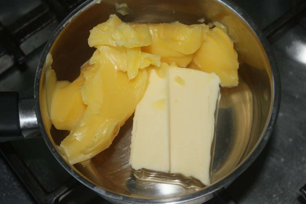- Mettez le beurre et le ghee dans une casserole. Je mets du ghee, alors que c’est indien (vous le trouverez assez facilement en boutique indienne, bio ou exotique, et évidemment sur internet), car il a un goût qui va donner au final, le vrai goût des feuilletés libanaise. Vous pouvez ne mettre que du ghee. Mais vous pouvez aussi ne mettre que du beurre, mais si vous voulez conserver très longuement vos feuilletés, il faudra le clarifier. C’est du beurre clarifié qui est utilisé au Liban.
