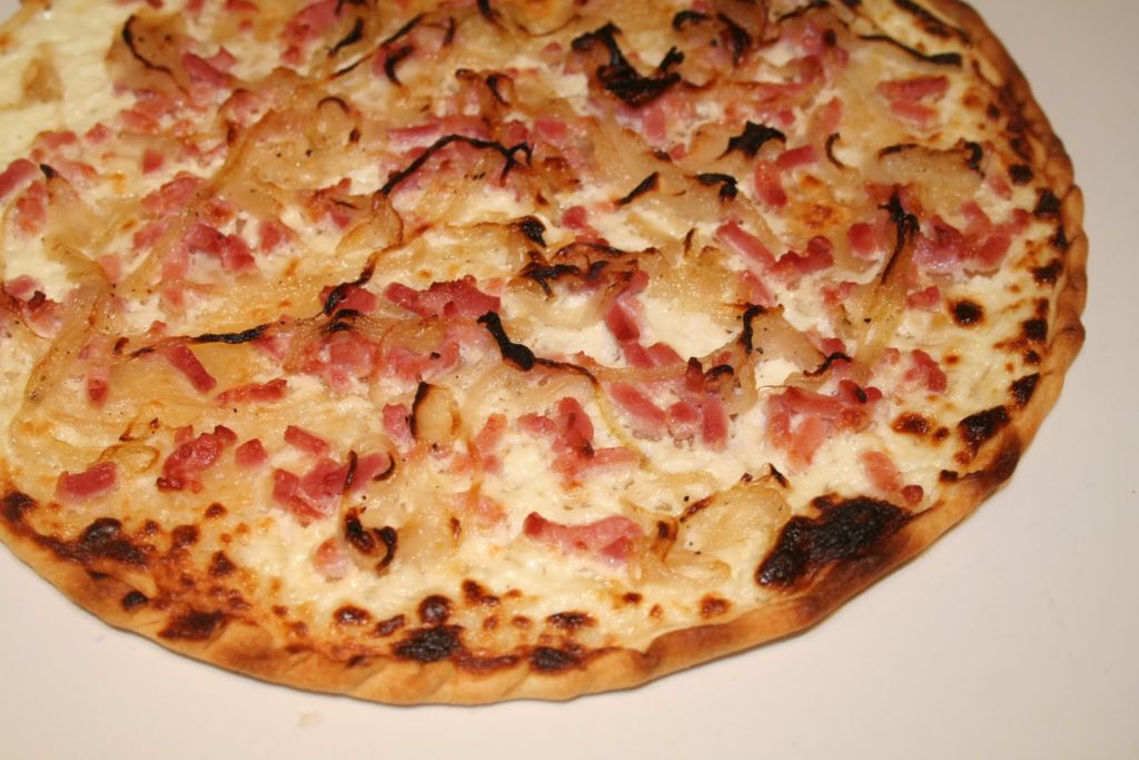 A Flammeküche ou Flammekueche ou Tarte Flambée é originária da Alsácia. Significa literalmente « cozinhado na chama ». Uma vez foi utilizado para verificar a temperatura do forno de pão. Assar pão era feito uma vez por semana com a família e para ver se o forno estava suficientemente quente, colocamos um bola de massa que foi espalhada, sobre a qual foram colocadas as banhas e as cebolas. Deliciosamente fino e crocante na parte de baixo, perfumado e liso na superfície!