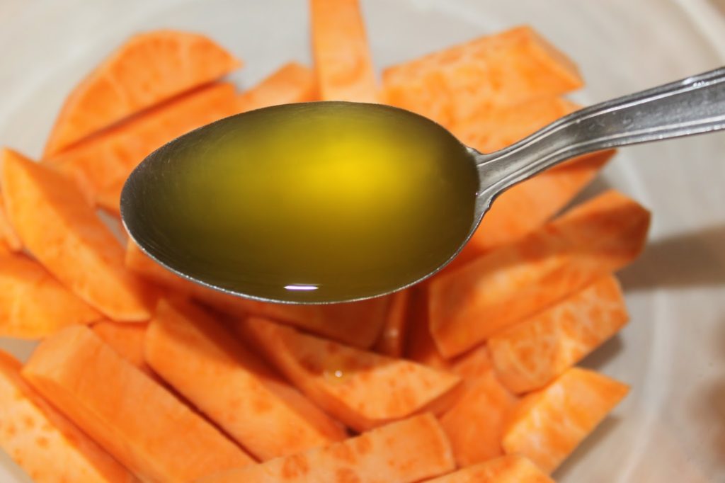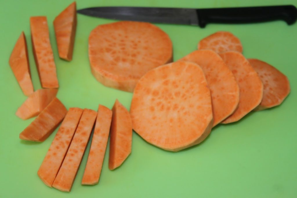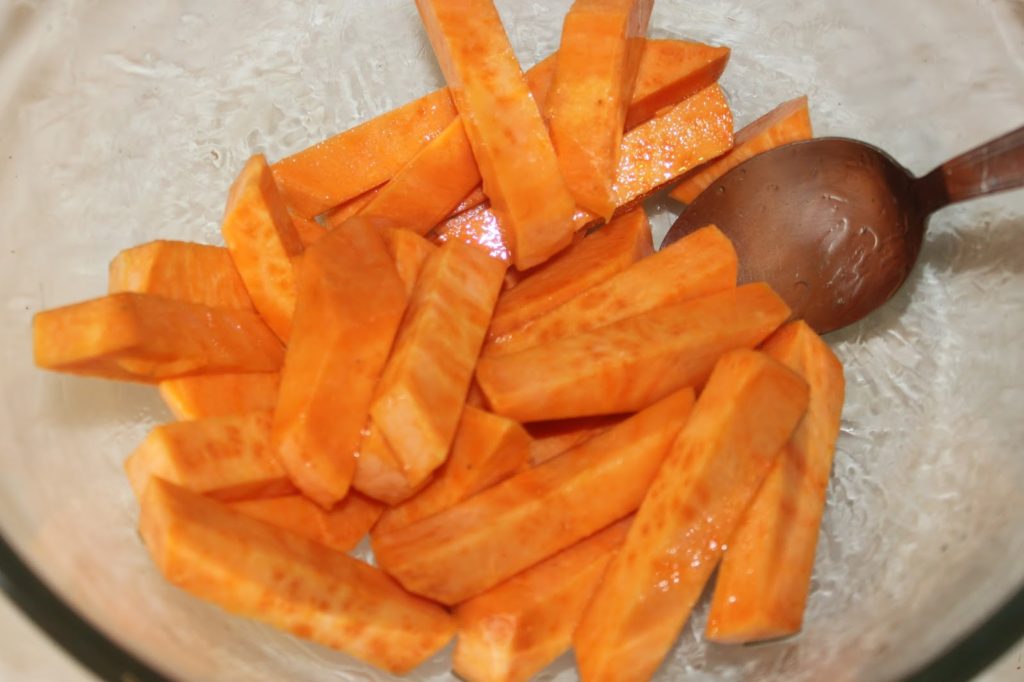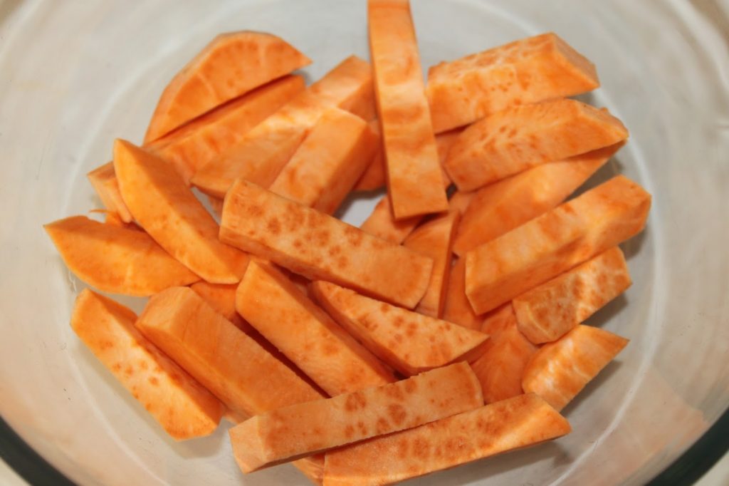 - Épluchez les patates douces, puis coupez-les en tranches puis en frites assez larges.