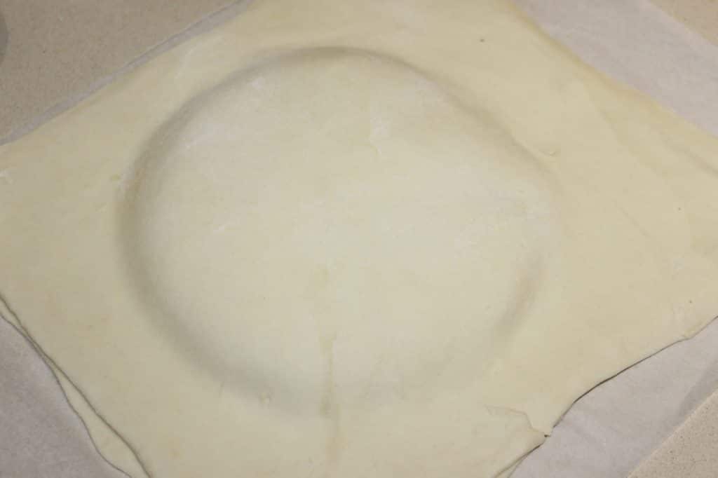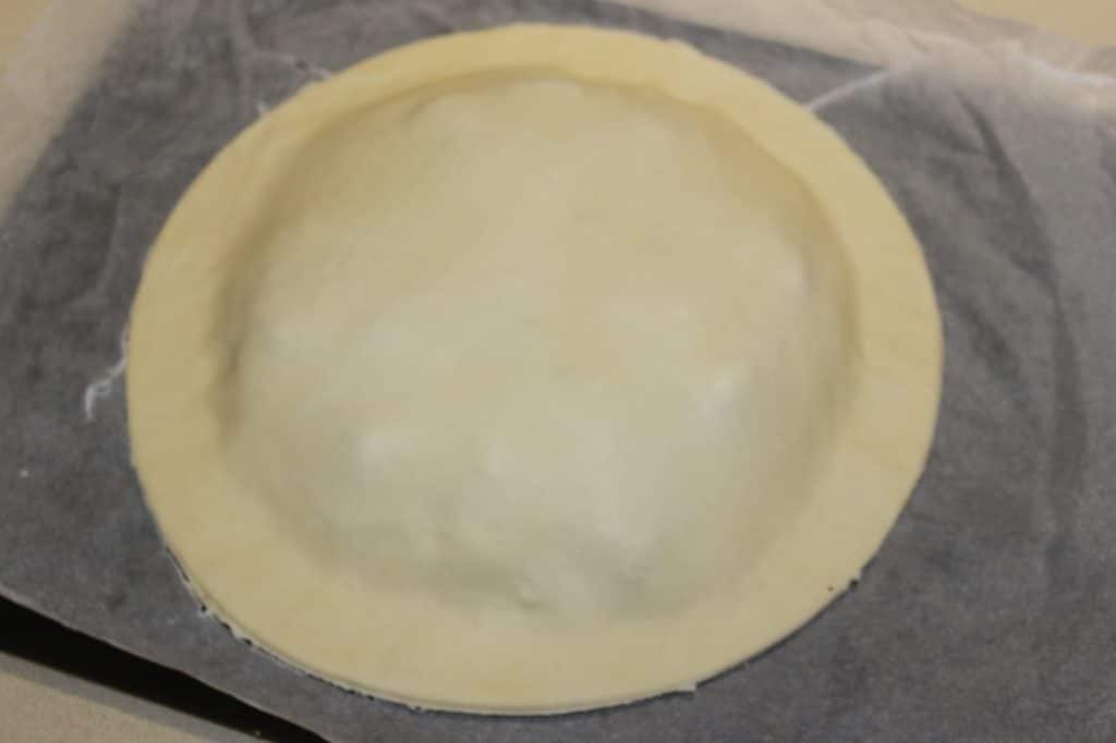 - Car il faut au moins 3cm entre la crème et le bord de la pâte. Le fait de poser un cercle, vous permet de voir jusqu’où aller. Mouillez la pâte avec un peu d’eau tout autour de la crème.