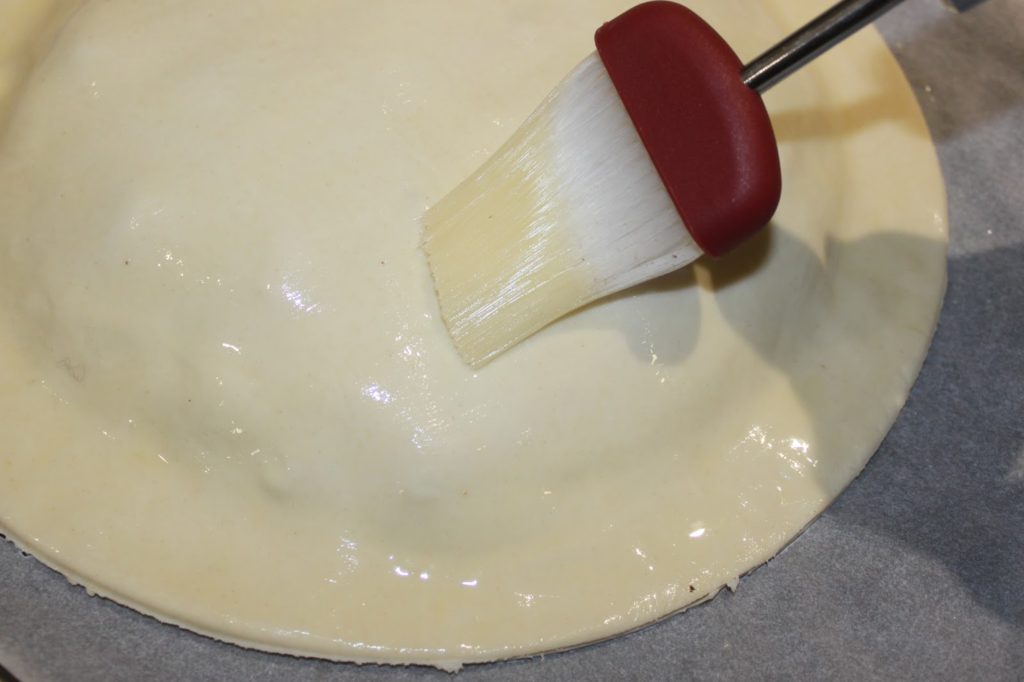 Car il faut au moins 3cm entre la crème et le bord de la pâte. Le fait de poser un cercle, vous permet de voir jusqu’où aller. Mouillez la pâte avec un peu d’eau tout autour de la crème.