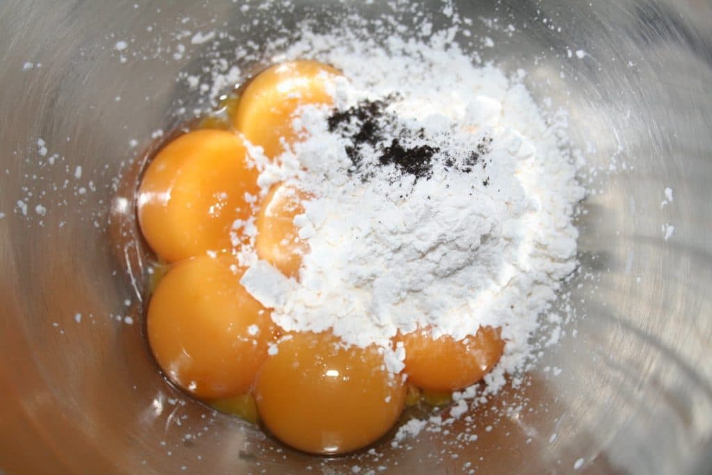 - La veille, préparez la pâte feuilletée et la crème pâtissière. Pour la crème pâtissière:Mettez le jaune d’œuf dans une jatte avec la vanille en poudre, la moitié du sucre et la poudre à crème. (sur la photo il y a plus de jaunes d’œuf que dans la recette, c’est bien 1 seul qu’il faut).