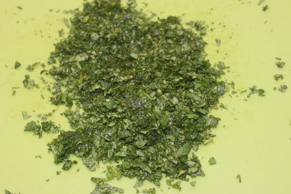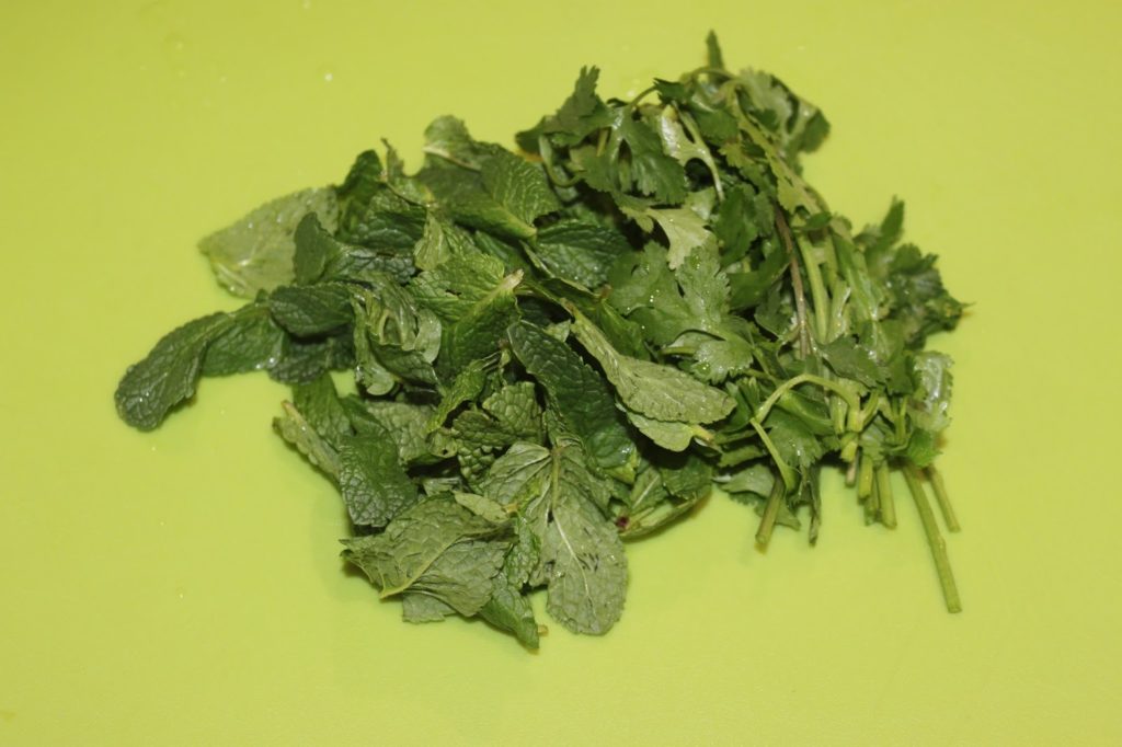 - Hachez finement les feuilles du bouquet de menthe et de coriandre.