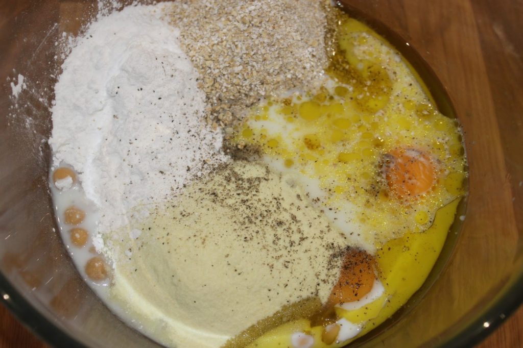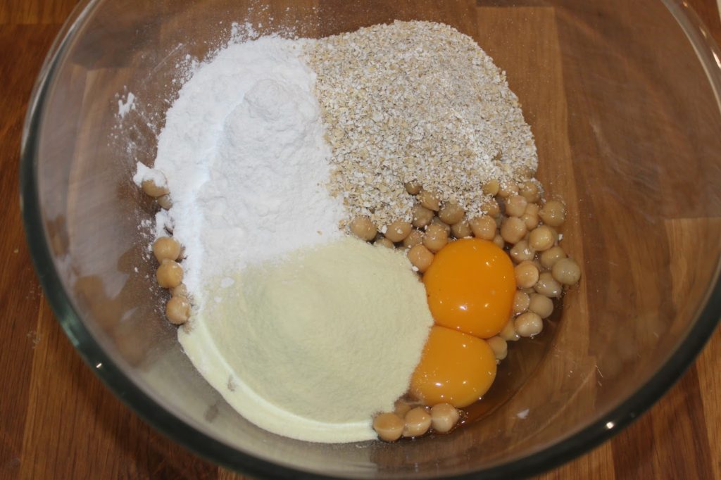 - Placez les pois chiches en boite égouttés dans un récipient. Nul besoin de les rincer. Cassez-y les œufs, versez le son d’avoine, la farine de riz, la levure chimique et les flocons de pomme de terre. Je prends en fait pour cela, la poudre pour purée de pomme de terre. Quand je veux une purée, je fais bien sûr une purée maison, mais j’achète cette poudre pour ce genre de recette.