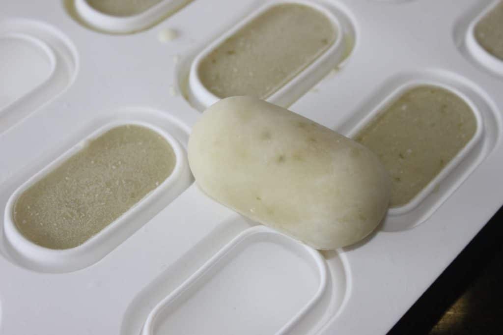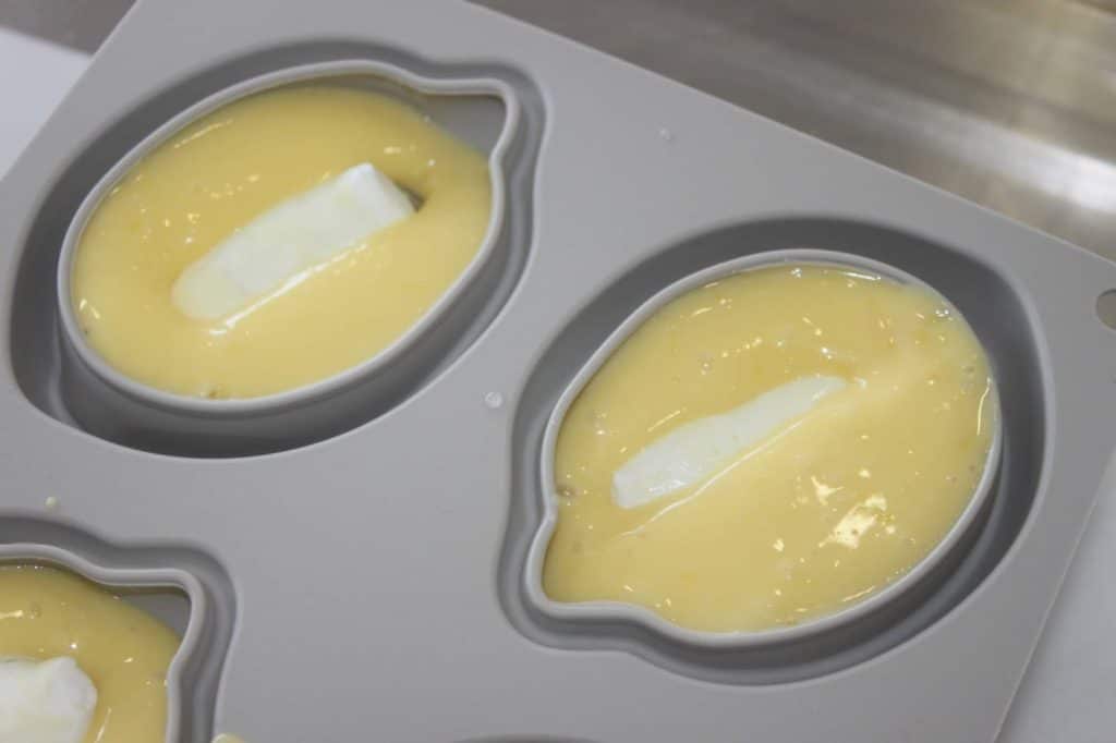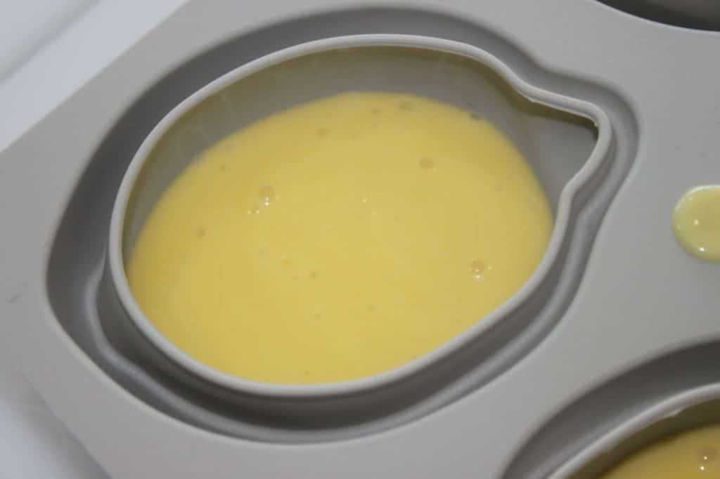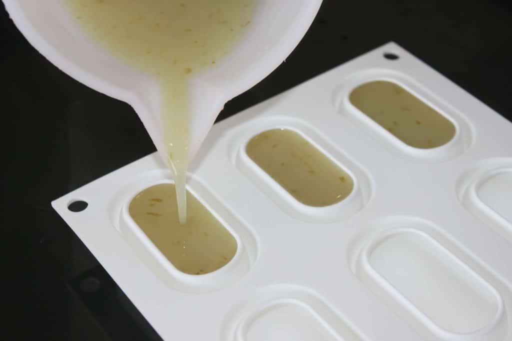 - Portez à ébullition et comptez 10 secondes. Versez dans des moules plus petits que les moules citron ou dans des moules à glaçons ! Ici j’étais chez Silikomart, donc nous avions tous les moules à disposition, mais des cubes à glaçons feront très bien l’affaire. Mais une autre option est encore d’utiliser les moules citron eux mêmes en versant dans 12 cavités. En les démoulant congelées, ces formes pourront s’insérer à nouveau dans la crème au citron (voir plus loin).