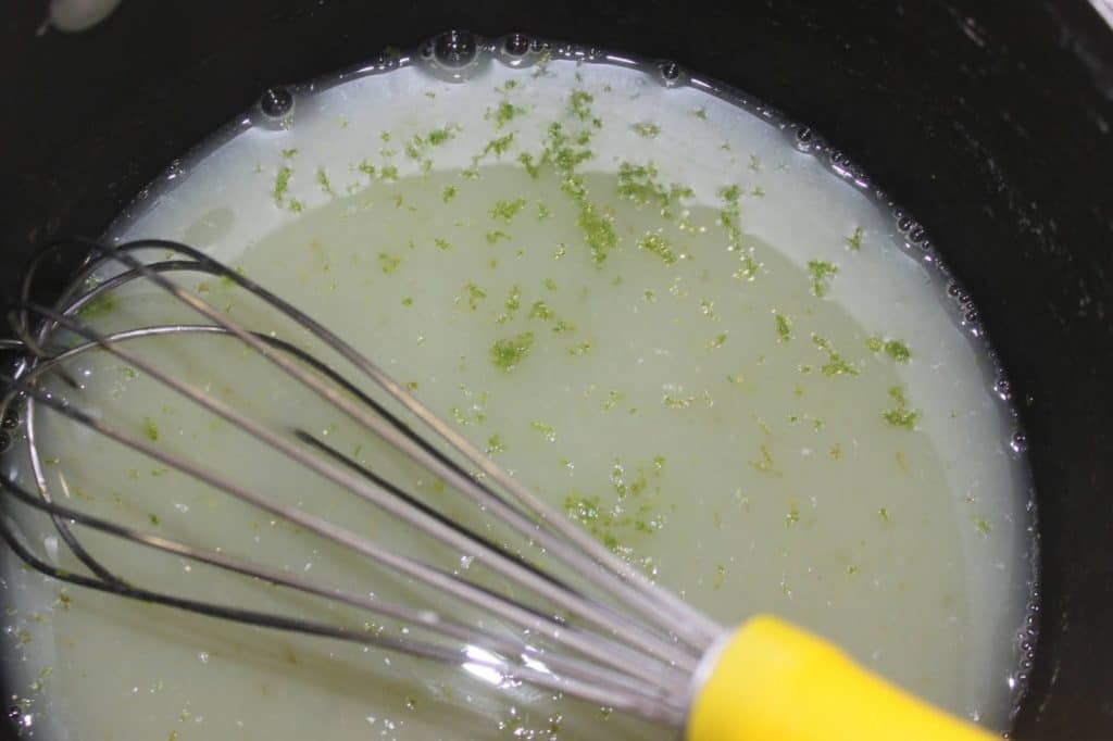 - Versez le jus de citron vert en mélangeant bien. Faites chauffer sur feu doux dans une petite casserole.