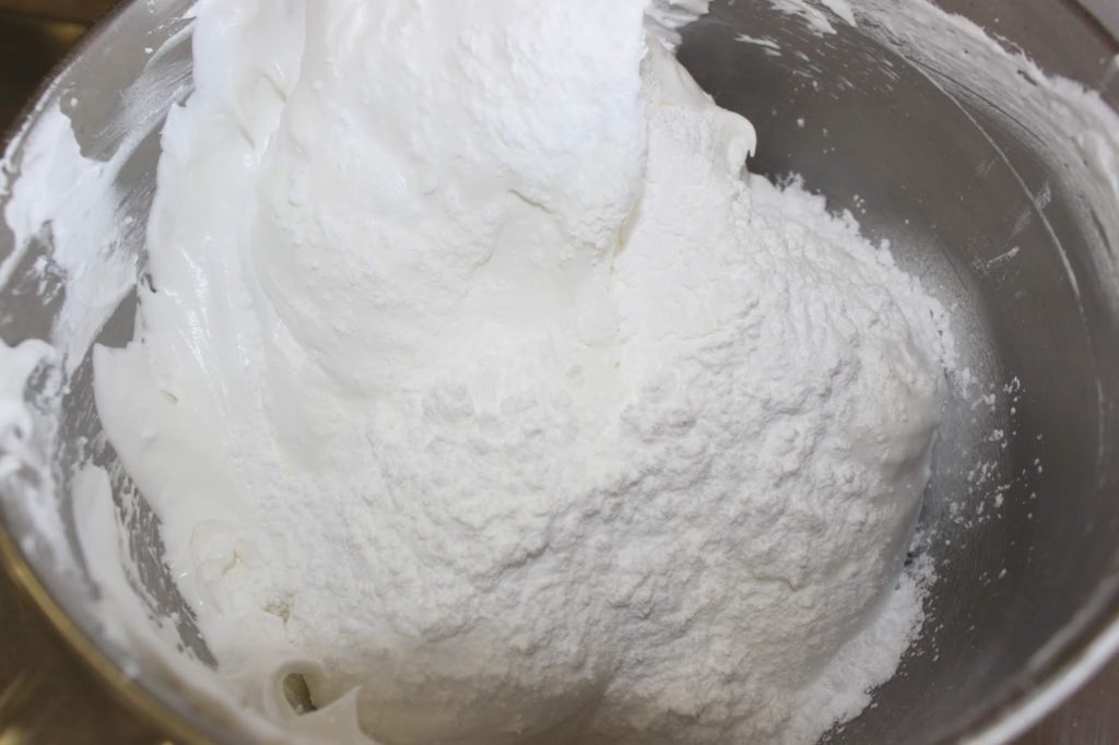 - Ajoutez le sucre glace et mélangez en soulevant avec une spatule comme pour une mousse au chocolat.