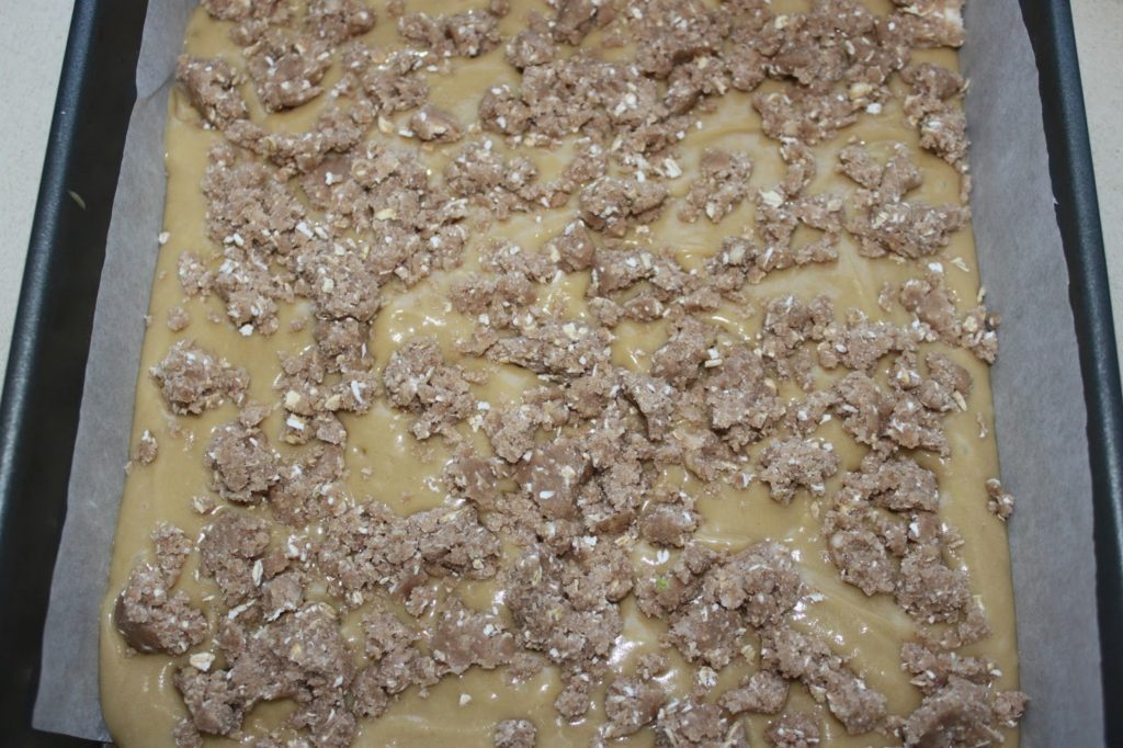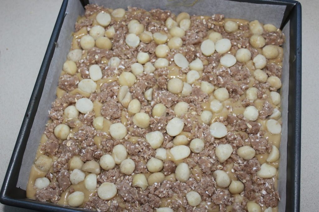 - Versez dessus le reste de pâte, puis les noix de macadamia et le reste de pâte à crumble.