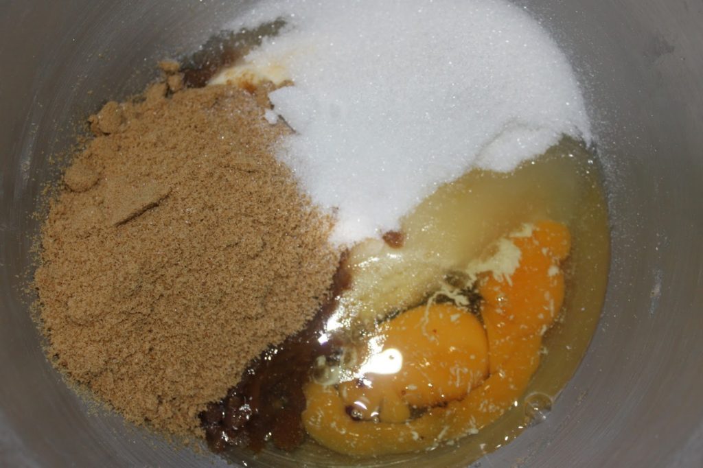 - Pour la pâte, dans la même cuve (nettoyée rapidement), versez les sucres, les œufs, la crème et l’huile.