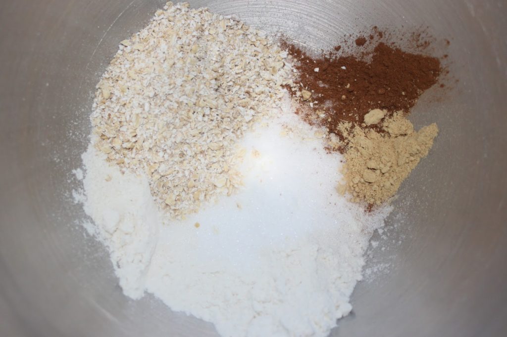 - Préparez le crumble à l’avoine et aux épices. Placez la farine, les flocons d’avoine, le sucre et les épices dans un récipient ou dans la cuve de votre robot.