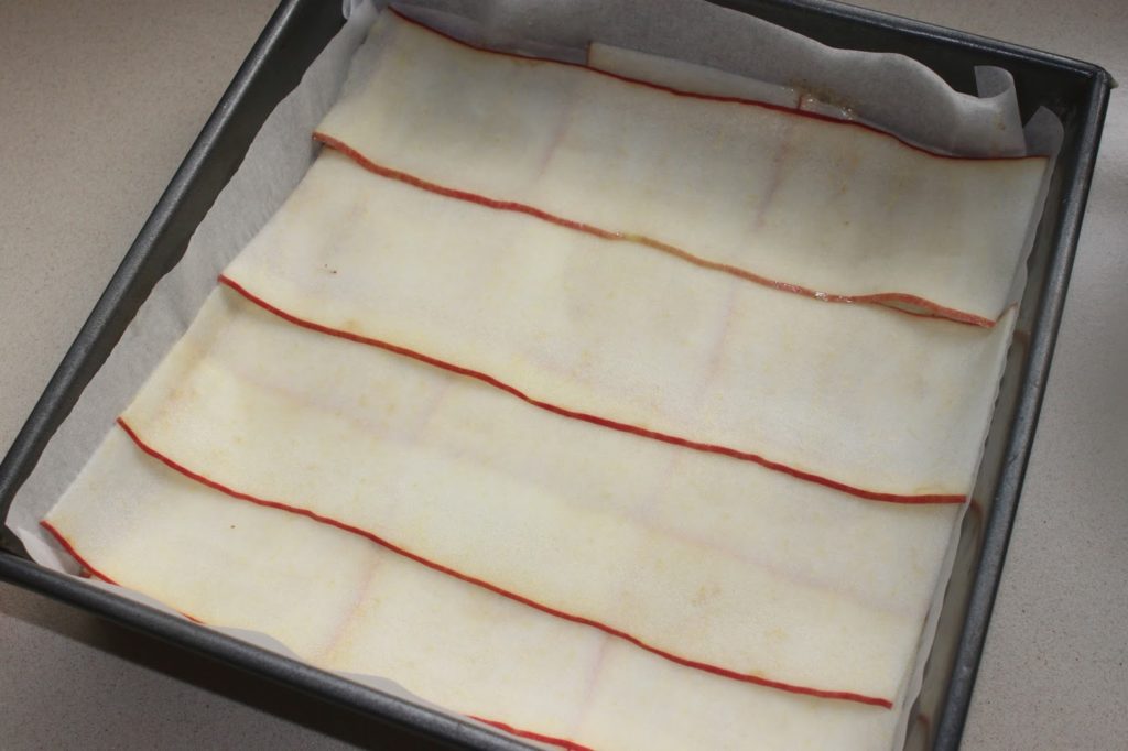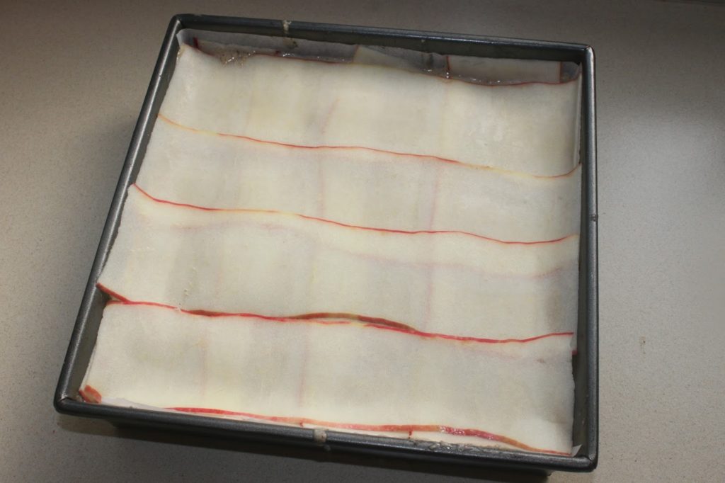 Versez une nouvelle louchée de pâte pour mettre une fine couche. Posez de nouveau un pomme entière en bandes.