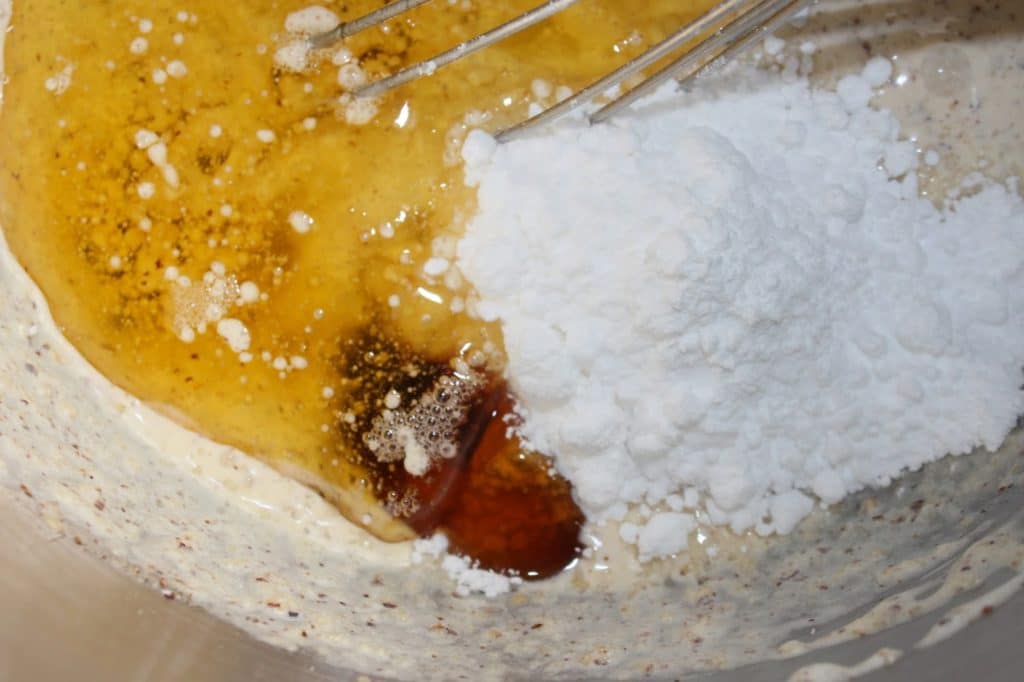 Ajoutez l’huile de noisettes (ou de colza), le sucre glace, le miel et la vanille.