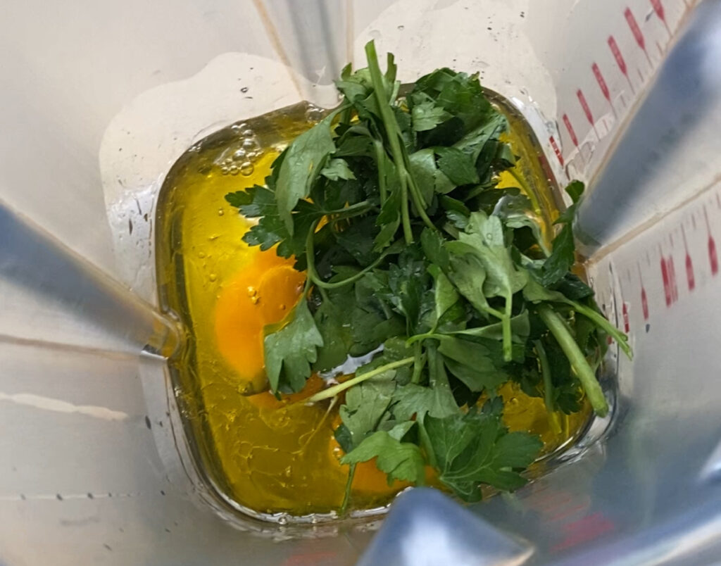 - Mettez l’huile choisie, les 200g d’œuf (environ 4 œufs moyens), le persil lavé et coupé en morceau et l’ail épluché dans un blender et mixez jusqu’à avoir une sorte de crème homogène.