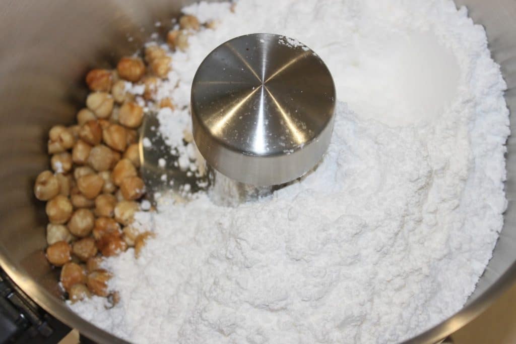 Para hacer una gianduia gigante, hago la pasta de avellanas en 4 tandas. De lo contrario, la batidora estará demasiado llena. Ponga 200 g de avellanas y 100 g de azúcar glas y redúzcalo a una pasta muy fina. Todo depende de la calidad de su batidora.