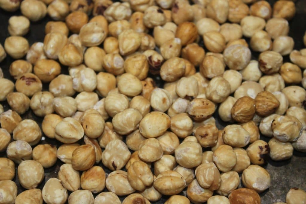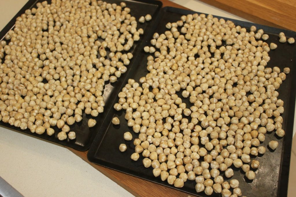 Colocar las avellanas en dos bandejas de horno (o en dos tandas) y tostarlas durante 12 minutos a 170°C.