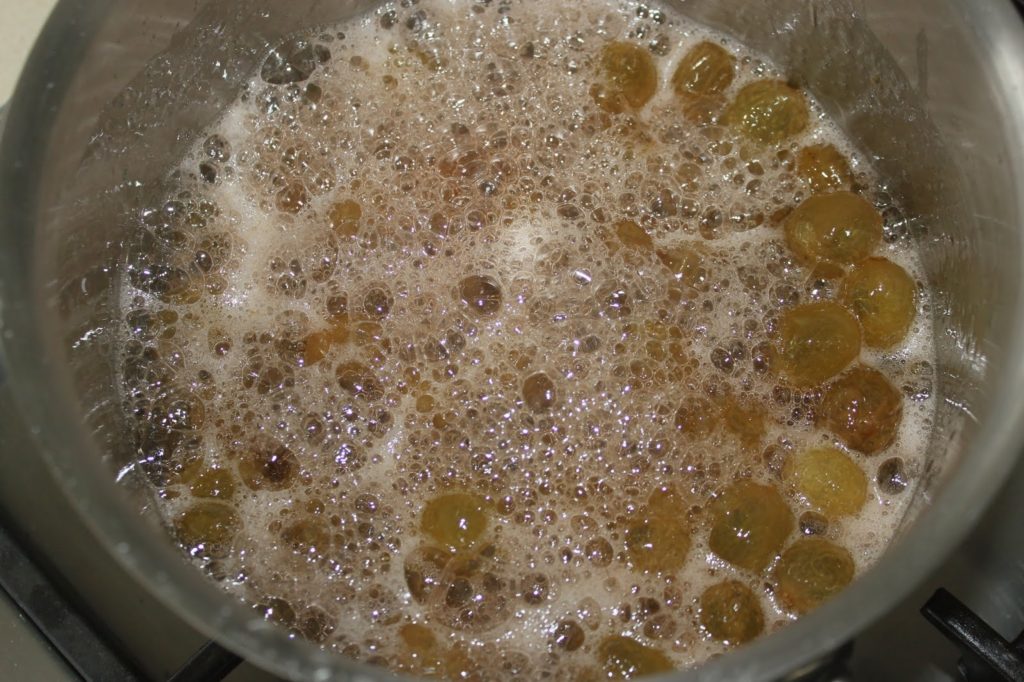 Detener el fuego cuando el jarabe se espese un poco. Ten cuidado de no hacerlo demasiado grueso tampoco, ya que se volverá aún más espeso cuando se enfríe. Dejar enfriar y guardar en un frasco.