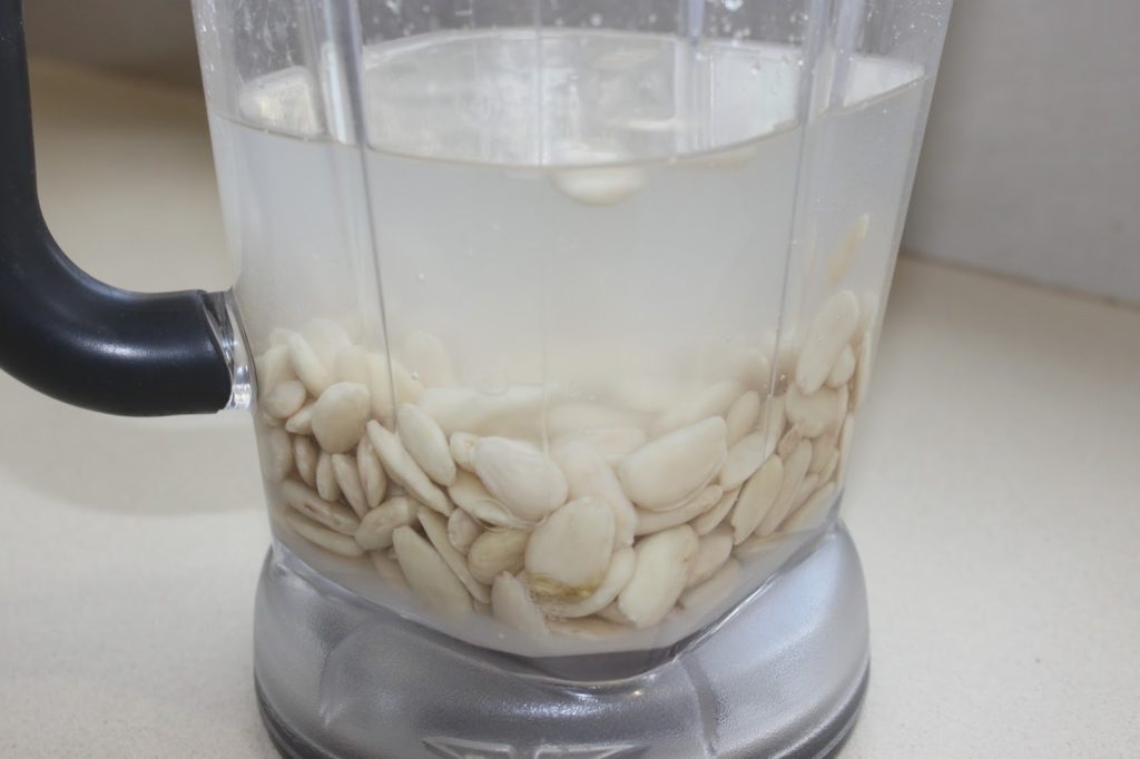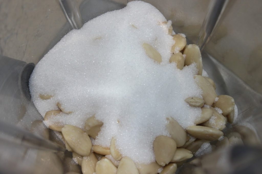 - Versez-les dans un blender avec le sucre et l’eau. Pour ma part, j’ajoute en plus une demi-cuillerée à café d’arôme amande amère.