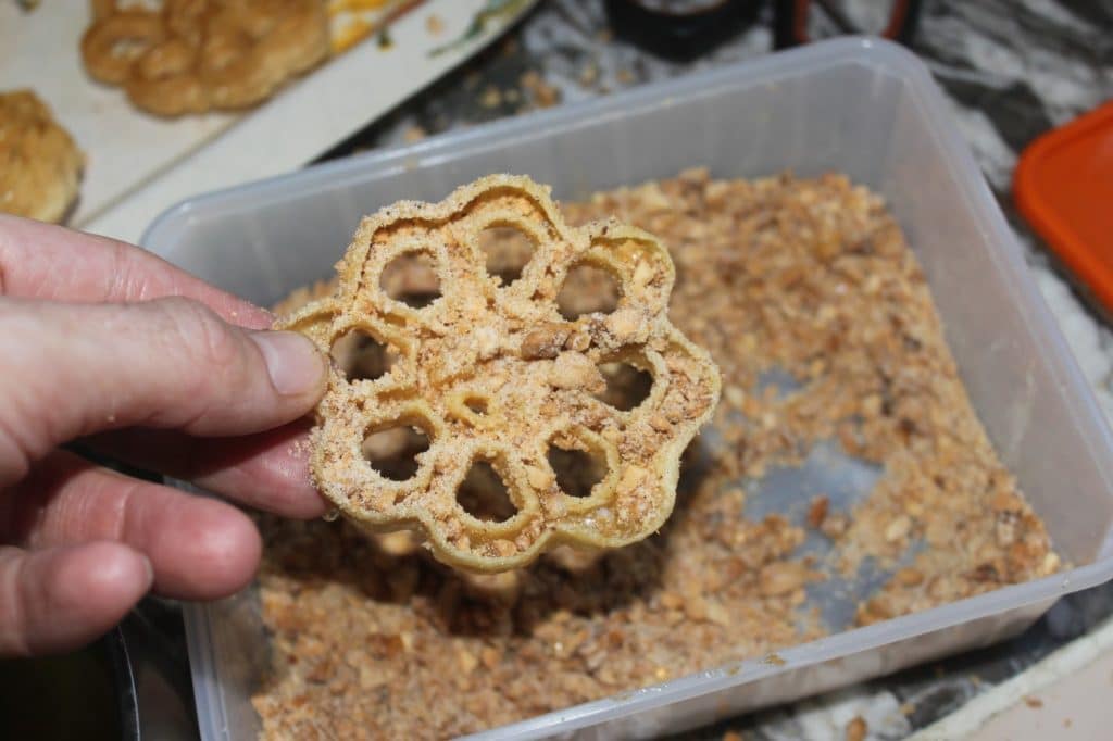 Cuando hayas cocinado toda la masa, ponla en el almíbar. Se puede aplicar con un pincel o simplemente sumergirlos.