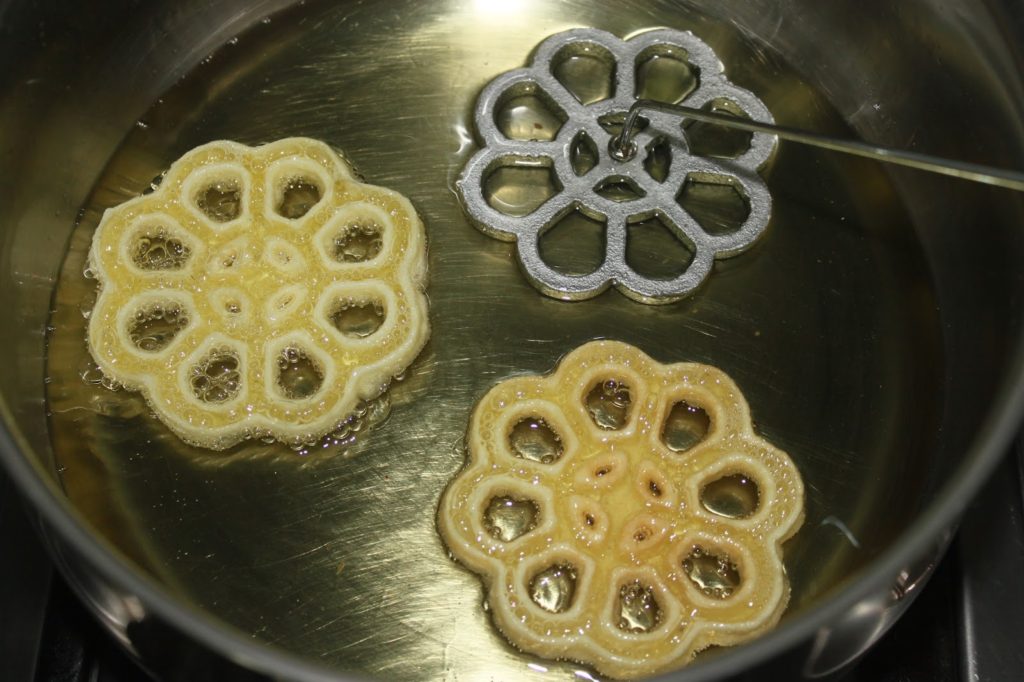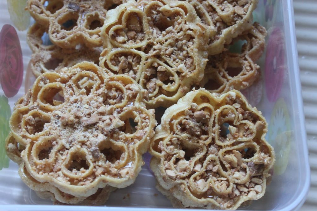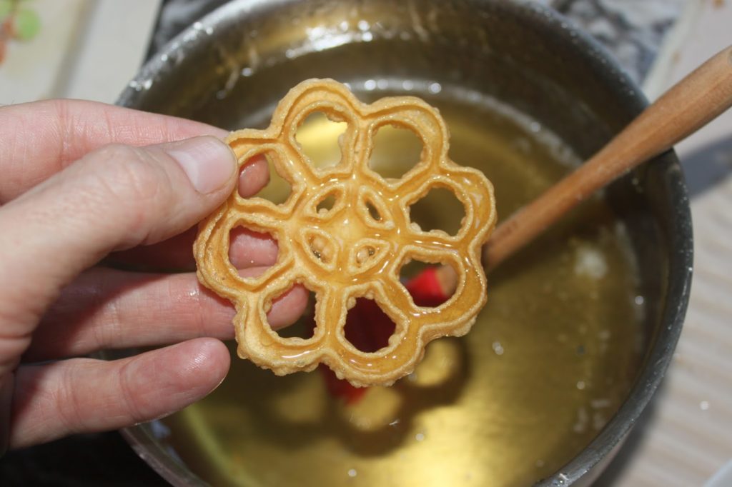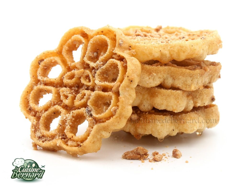 Actualmente estoy en Marruecos y me dedico a cocinar con mis amigos. Hicimos estas rosquillas porque ya era hora. Hace más de 5 años que tengo la plancha que se necesita para esta receta. Estos donuts de hierro se encuentran en todo el Magreb, en Asia (en Camboya y Tailandia con formas de flor de loto), pero también en Noruega (y también en toda Escandinavia). Allí, estos pasteles se llaman « rosetas » y hay muchos patrones de hierro diferentes. Había comprado más planchas en Oslo. Normalmente se cubren simplemente con azúcar glas. En esta versión oriental, se sumergen en almíbar y luego se cubren con almendras tostadas con azúcar glas y canela. ¡Ya te puedes imaginar por qué este es el que acaba en mi blog! ¡Una delicia ultra crujiente! Para la plancha, puedes encontrar muchos tipos diferentes en Internet.