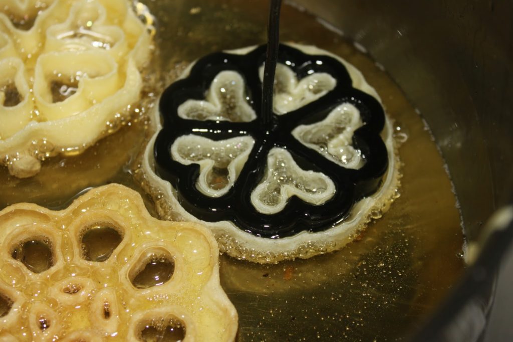 Vuelve a poner la plancha en el aceite. Manténgalo estático durante un rato para que la masa comience a freírse sin moverse.