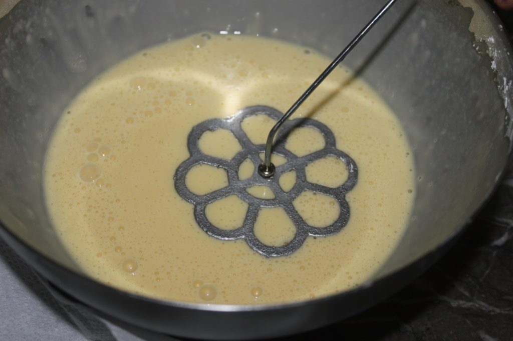 Deje que las rosquillas se coloreen suavemente. Volver a dejar la plancha en el aceite antes de repetir la operación: quitar el aceite, sumergir en la pasta, sumergir en el aceite.