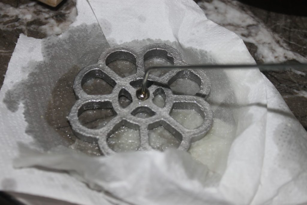 Sumergir la plancha parcialmente en la masa. La masa no debe sobrepasar el patrón. Aquí, en la foto, estoy en mi mejor momento. Dejar la plancha en la masa durante 3 segundos.