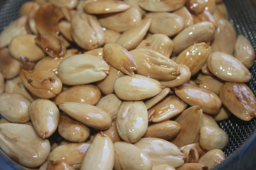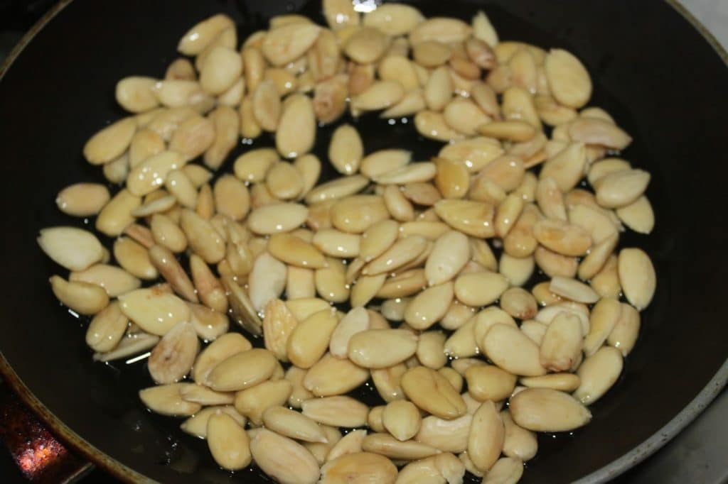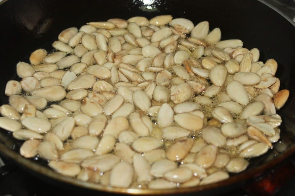 En el caso de las almendras, es mejor freírlas, ya que así se consigue un color más bonito y uniforme. En el peor de los casos, puede asarlas en el horno durante 10-15 minutos a 175°C. Para la forma tradicional, poner en una sartén las almendras y 6 cucharadas de aceite neutro (de colza). Que no cunda el pánico, porque después los vaciaremos.