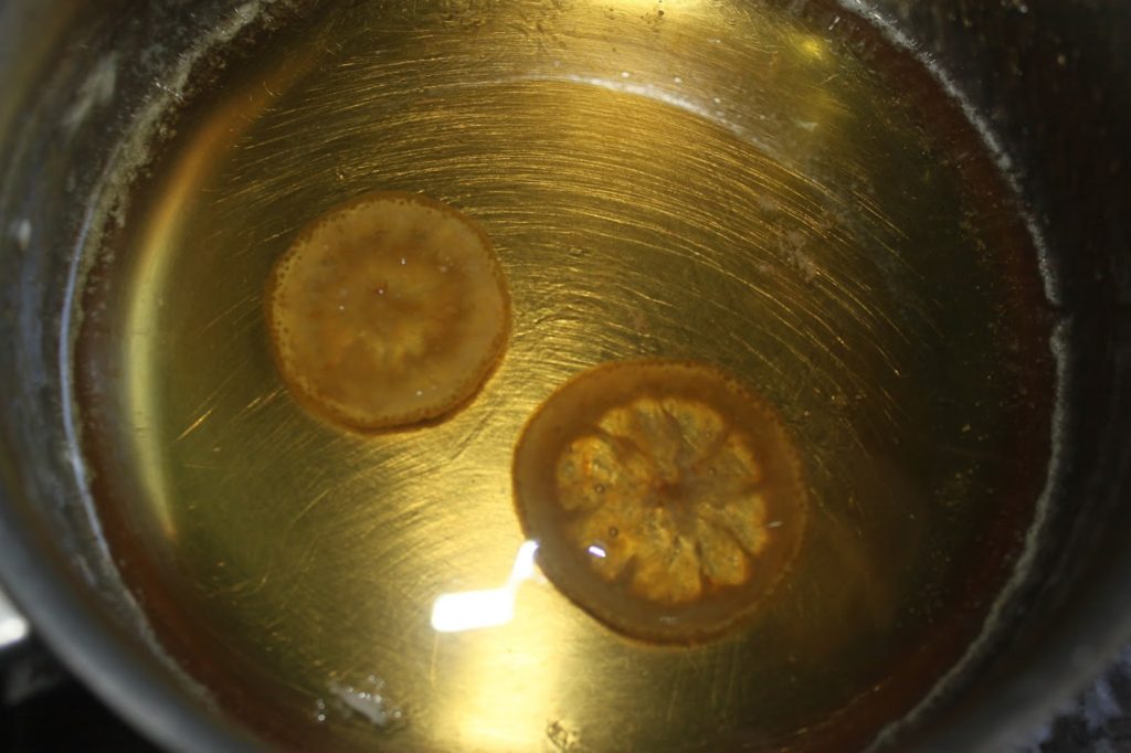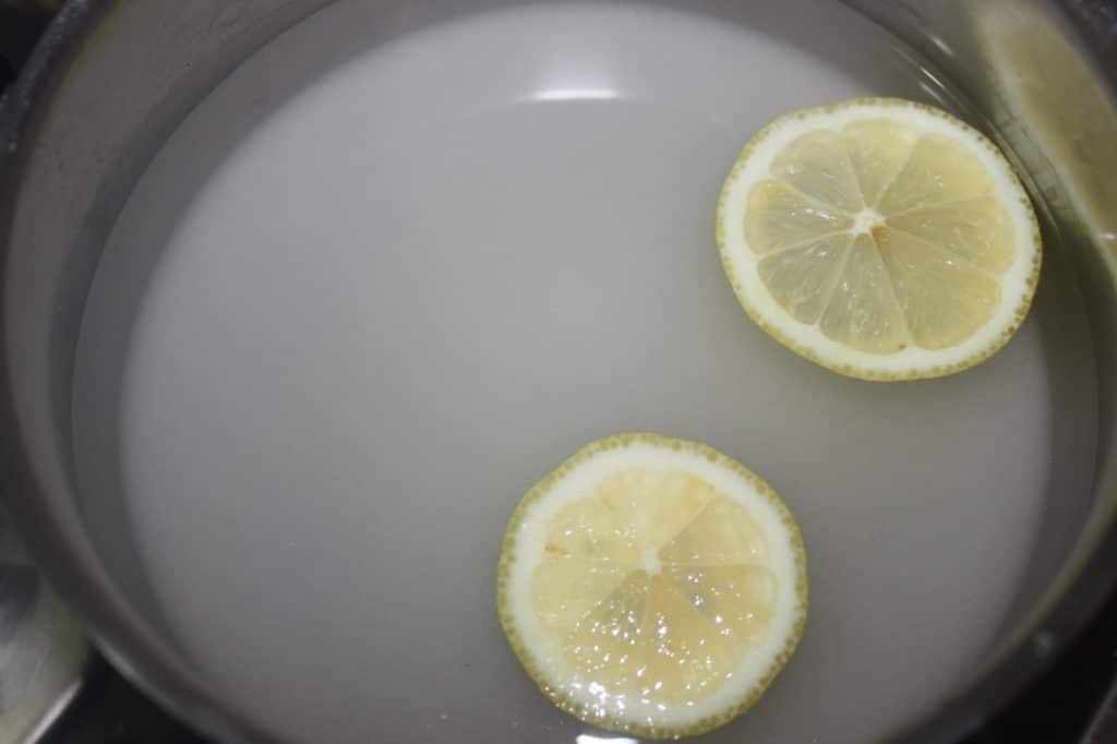 Comience por preparar el almíbar. Incluso puedes hacerlo la noche anterior. Poner el azúcar, el agua y las rodajas de limón en un cazo.