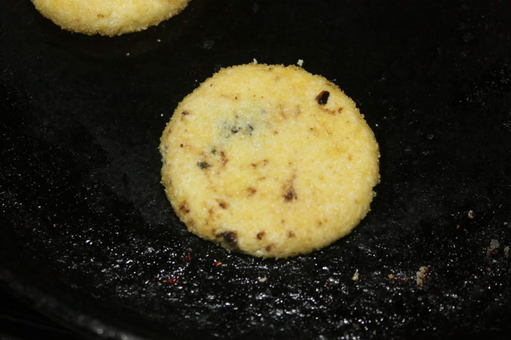 - Placez la boule dans une poêle chaude et aplatissez-la à la main pour en faire un petit disque.