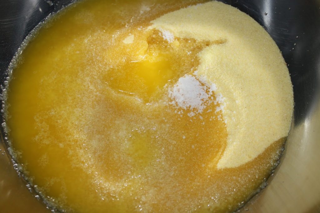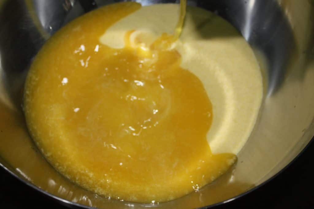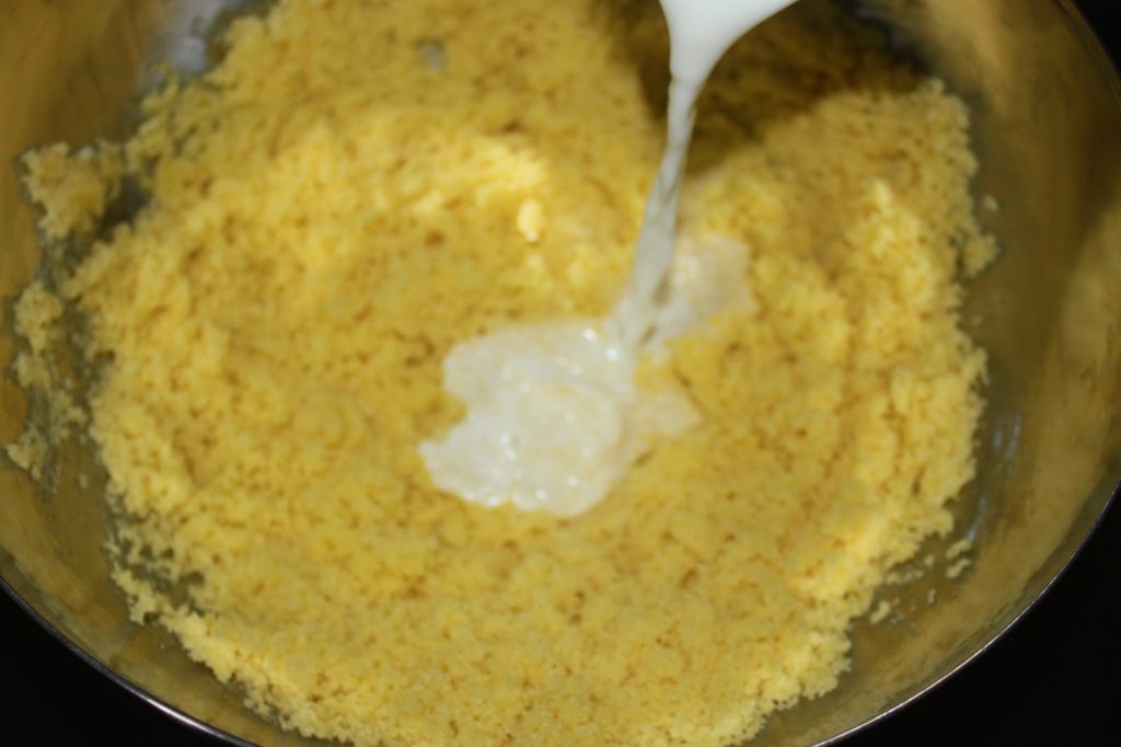 - Versez l’huile et le beurre fondu dans la semoule.