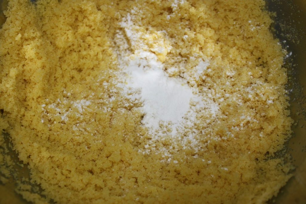 Mettez de côté 175g de ce mélange dans un récipient à part. Cela nous servira pour la suite. Versez la levure chimique dans le reste de la semoule (pas les 175g !).