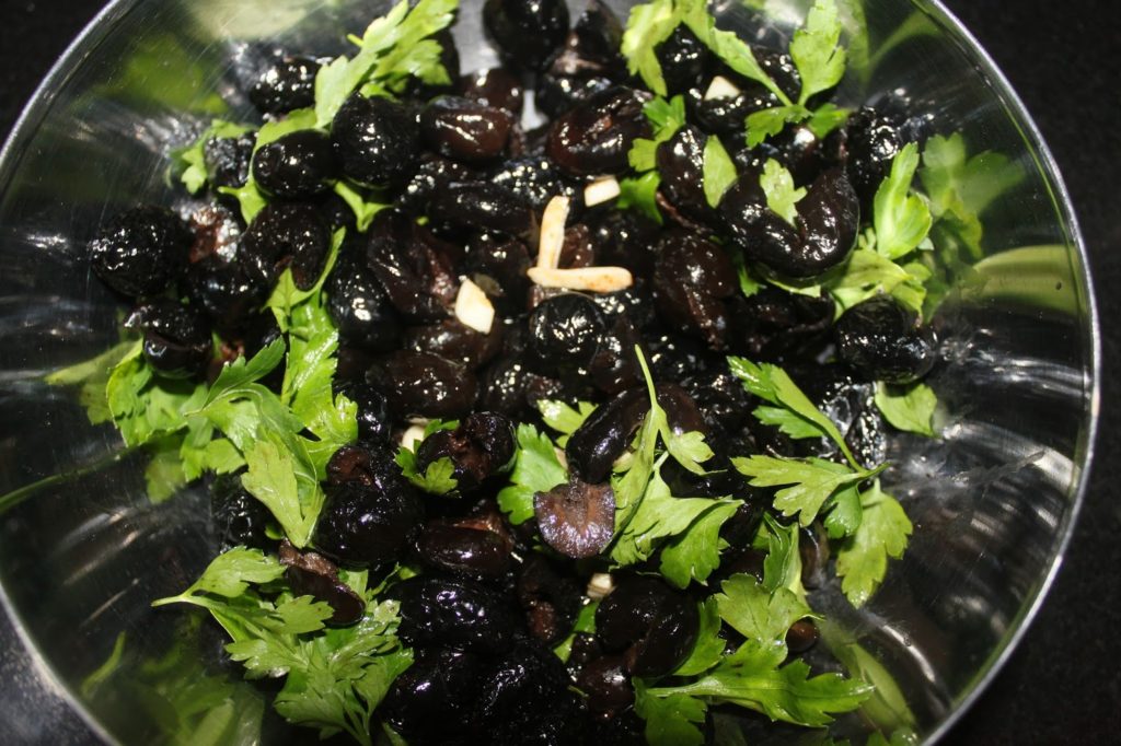 Mettez dans un récipient ou un mixeur, les olives, l’ail, le persil et l’huile d’olive.