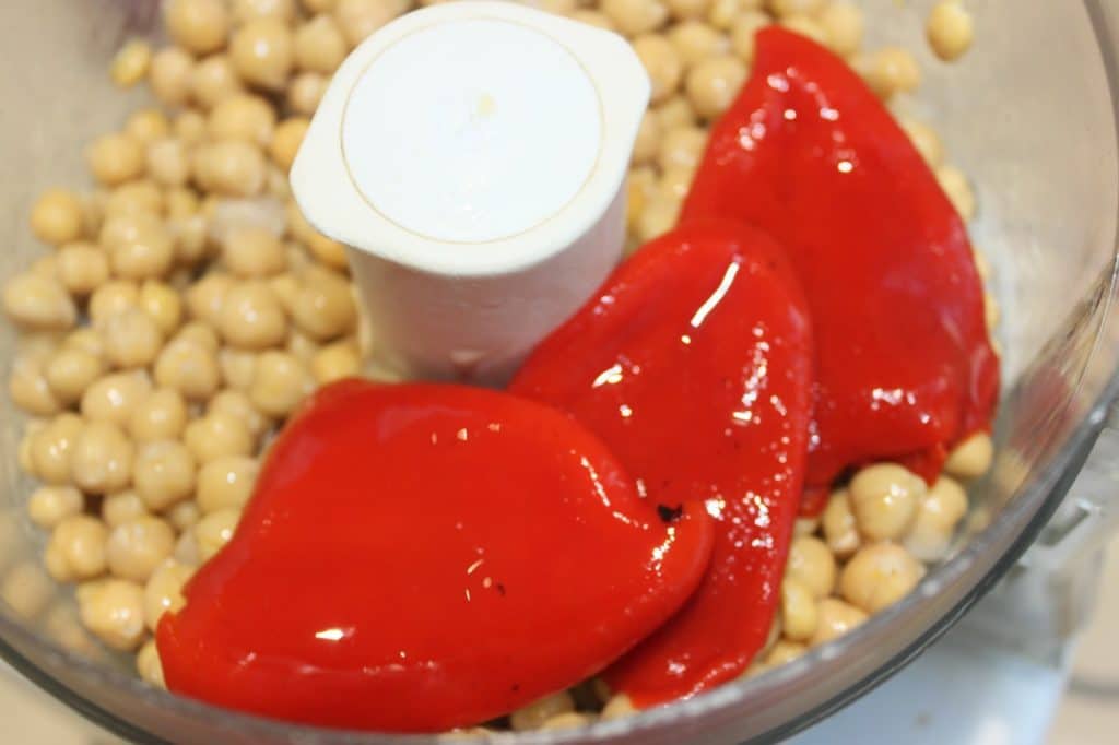 - Placez les pois chiches égouttés et les poivrons dans le bol de votre mixeur. Je fais cette fois entorse à la tradition et je mets tout dans le mixeur, car de cette façon, le hoummos est prêt en 3 minutes…Note de Bernard : pour cette recette expresse, je prends des pois chiches en boite ou en bocal. Vous trouverez aussi facilement des poivrons grillés en bocal. Cela conviendra parfaitement ici.