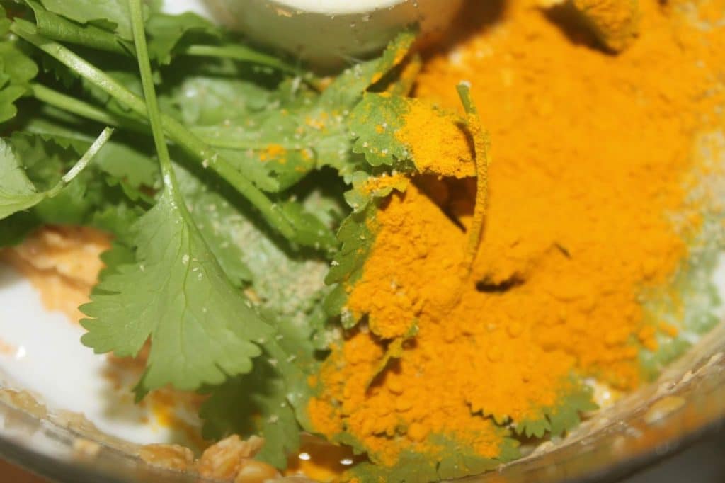 - Mais aussi l’huile, le lait de coco, les épices, (sel et poivre à votre goût) et le petit bouquet de coriandre. N’oubliez pas le jus de citron vert et le vinaigre blanc.